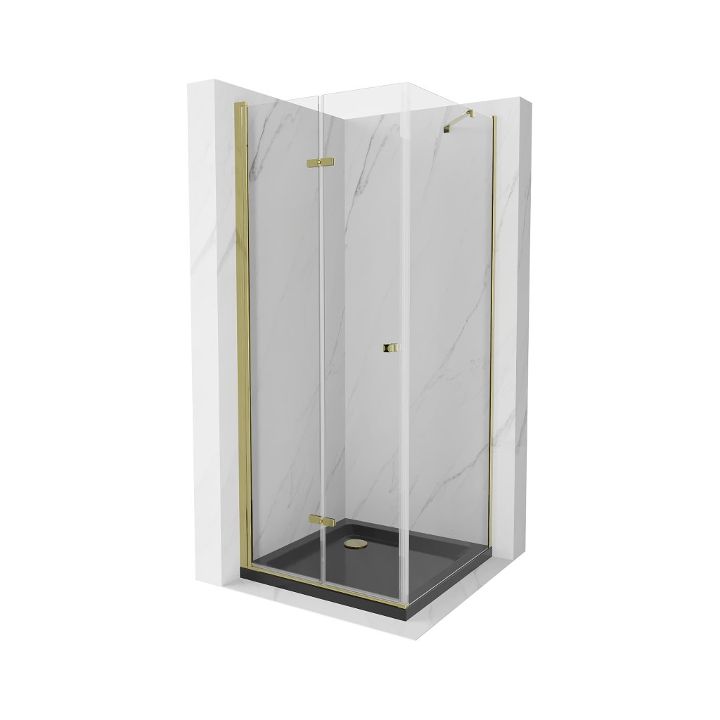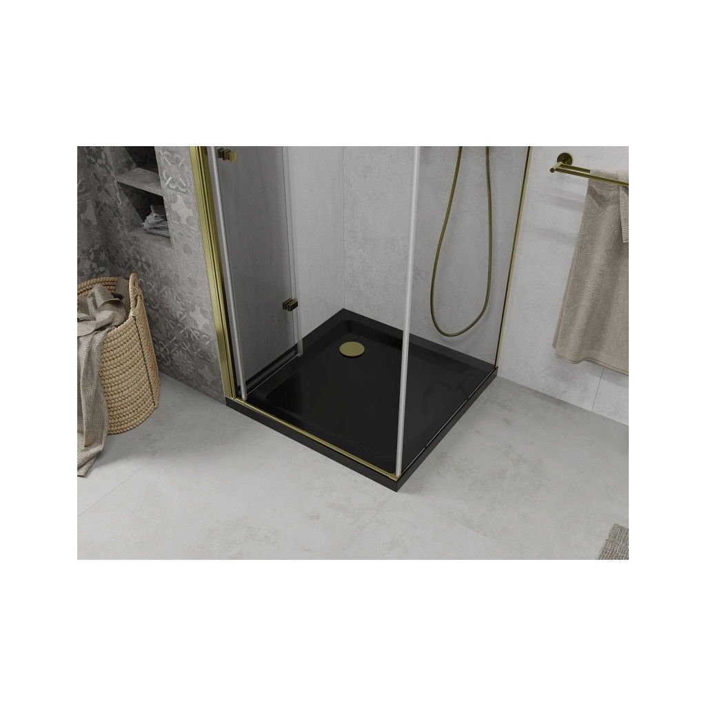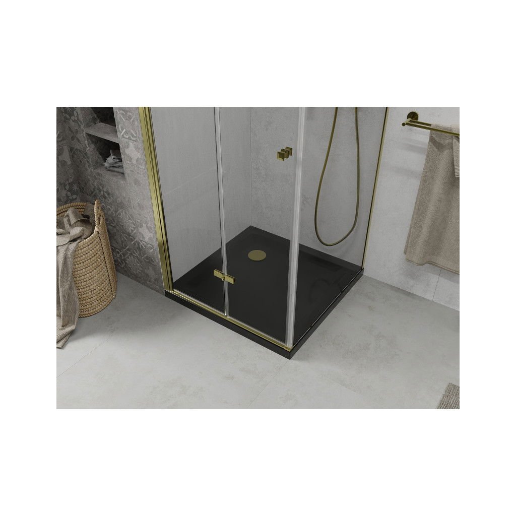 Mexen Lima, sprchový kút so skladacími dverami 80 (dvere) x 80 (stena) cm, 6mm číre sklo, chrómový profil + slim sprchová vanička čierna + zlatý sifón, 856-080-080-50-00-4070G