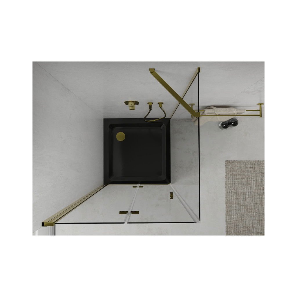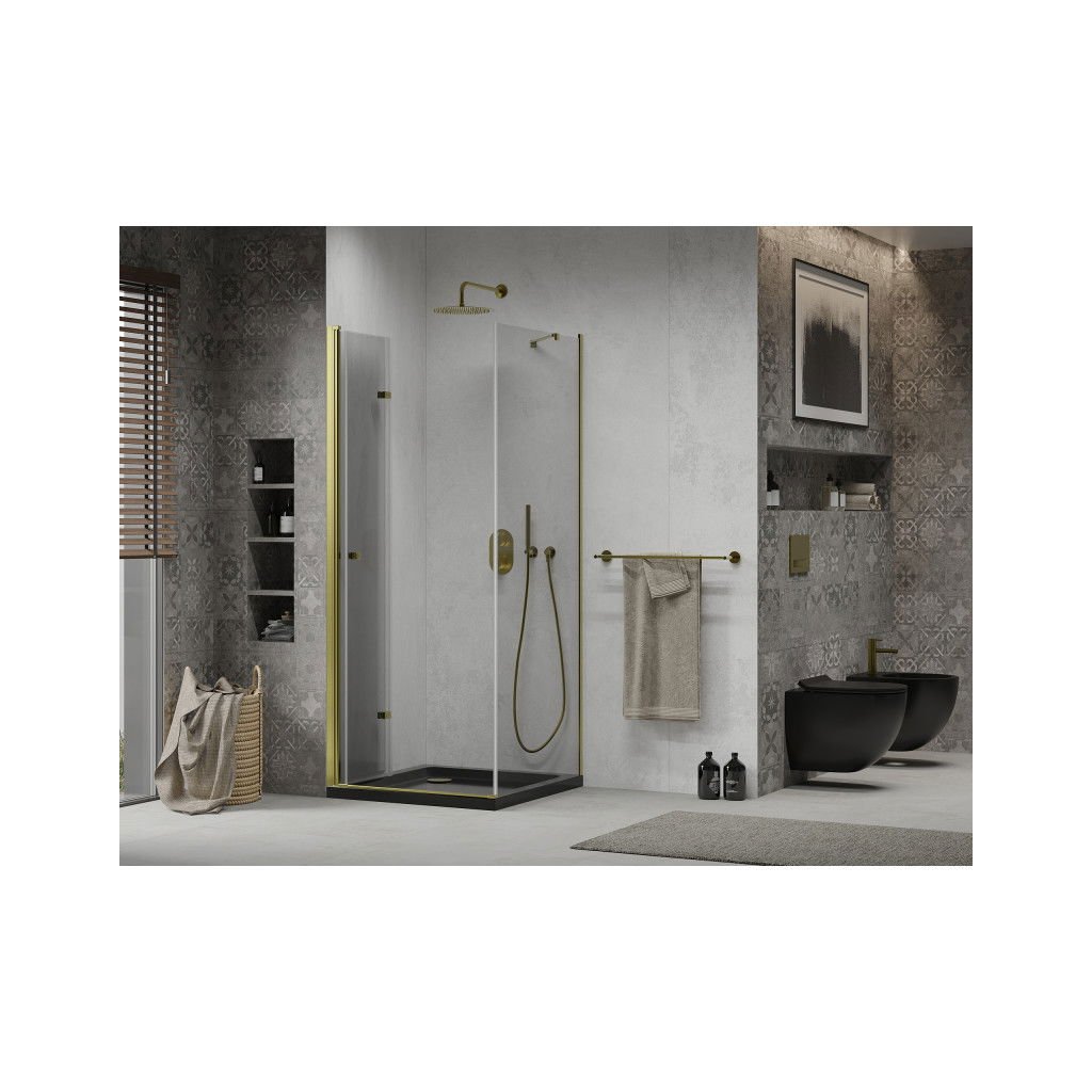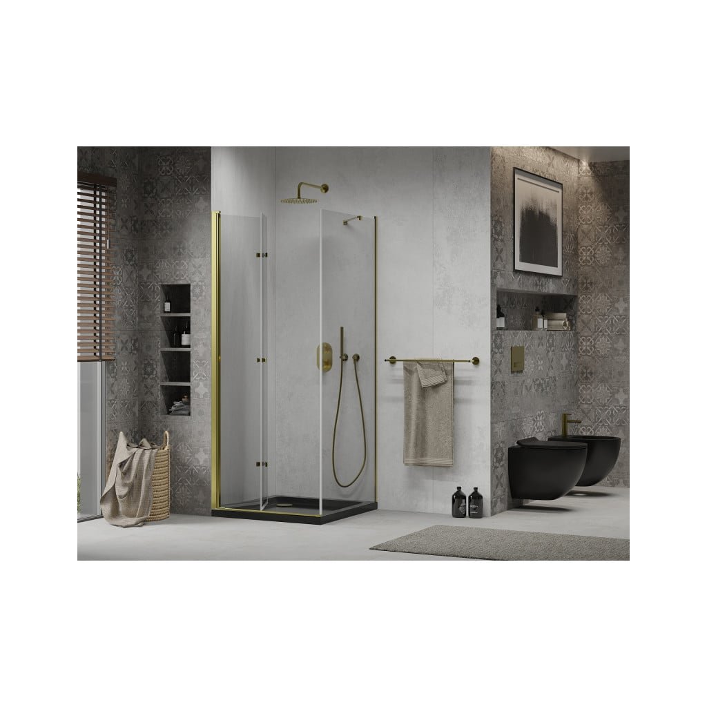 Mexen Lima, sprchový kút so skladacími dverami 80 (dvere) x 80 (stena) cm, 6mm číre sklo, chrómový profil + slim sprchová vanička čierna + zlatý sifón, 856-080-080-50-00-4070G