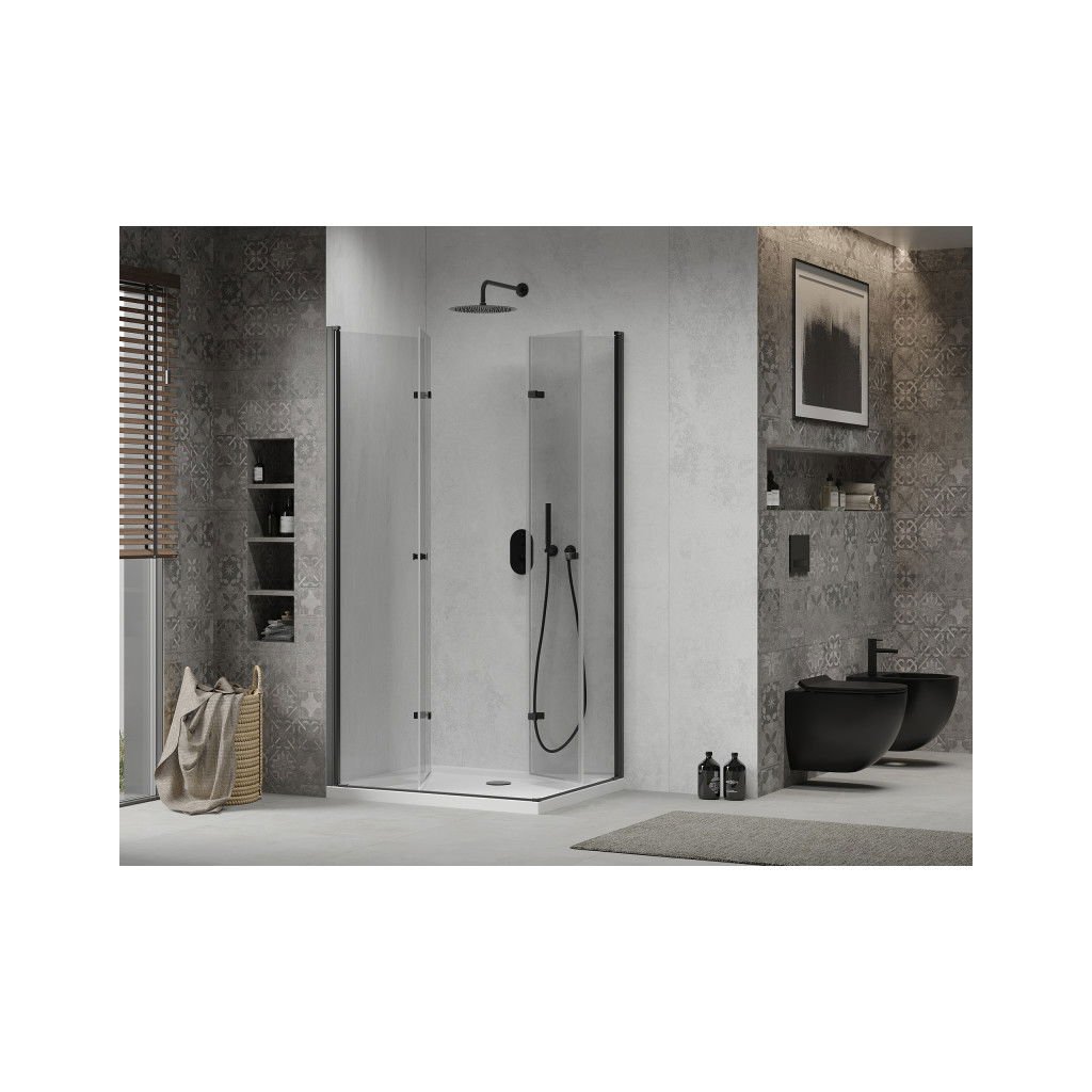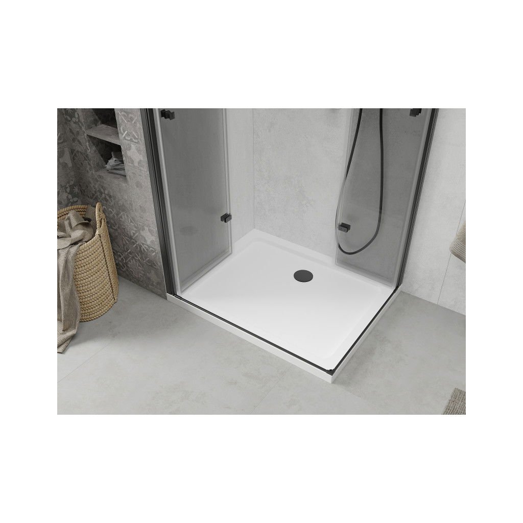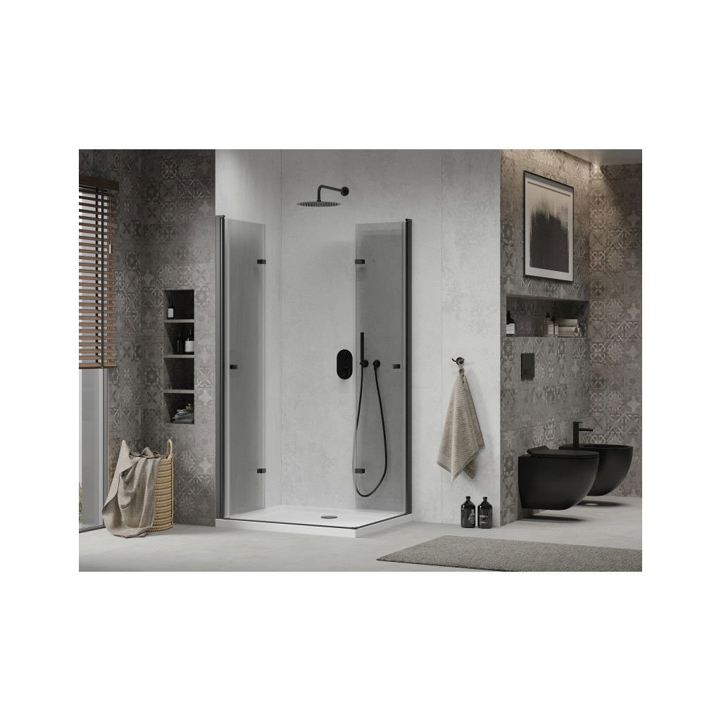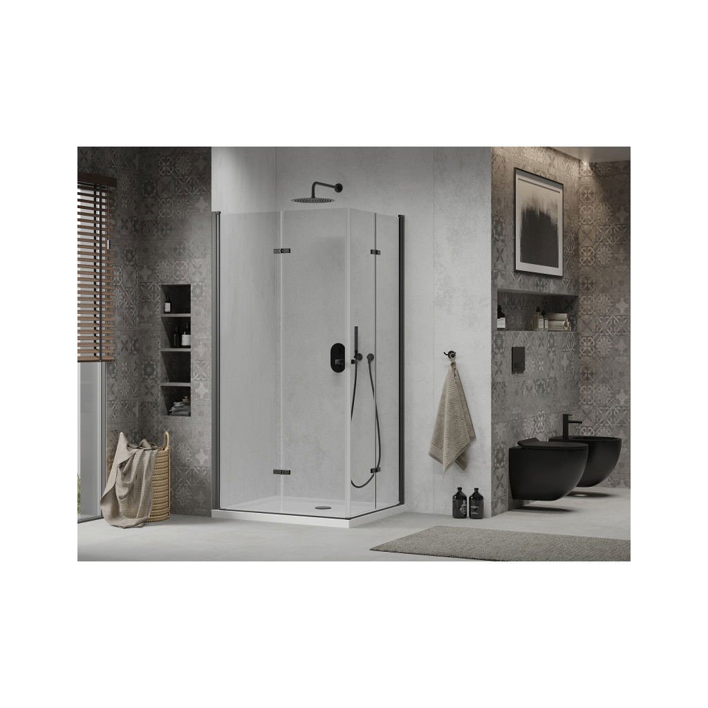 Mexen Lima Duo, sprchovací kút s 2-krídlovými skladacími dverami 90 (dvere) x 80 (dvere) cm, 6mm číre sklo, čierny profil + slim sprchová vanička 5cm biela s čiernym sifónom, 856-090-080-70-02-4010B