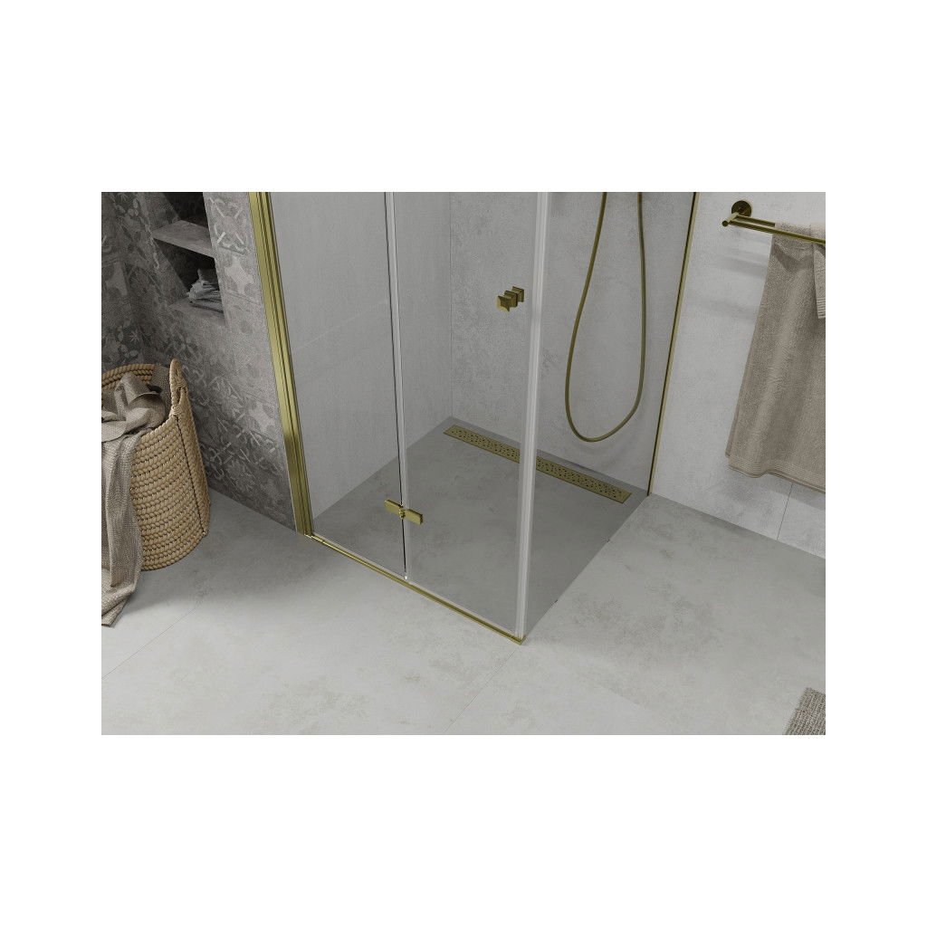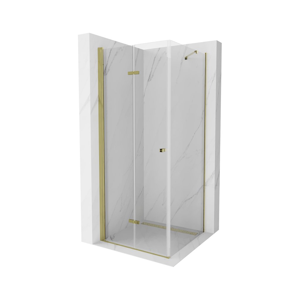 Skvelá voľba do každej kúpeľne. Elegantný sprchový kút je vyrobený zo 6 mm hrubého tvrdeného skla v čírom prevedení. Aplikovaná povrchová úprava skla zaisťuje maximálny komfort všetkým užívateľom. Táto technológia zaručuje jedinečné vlastnosti zabraňujúce znečisteniu skla - povrch stačí iba opláchnuť vodou. Kút je uchytený v zlatých hliníkových profiloch a je vybavený tesnením zabraňujúcim úniku vody mimo sprchovací kút. Dvere sprchovacieho kúta sú skladacie (dve sklá spojené kvalitnými pántami s možnosťou zloženia dovnútra aj von). Na otváranie slúži decentná kovová rukoväť.