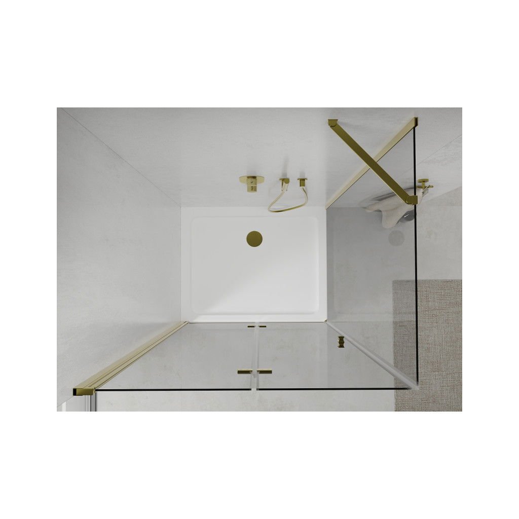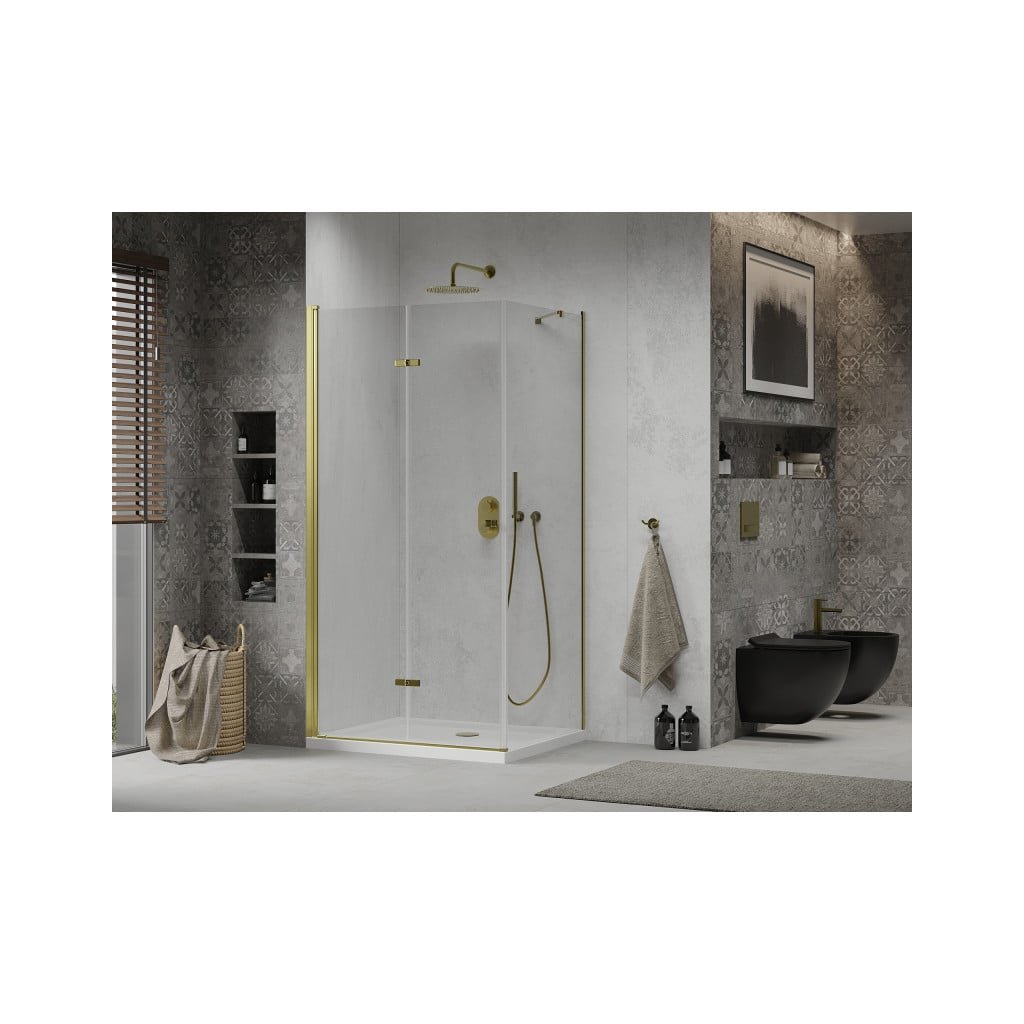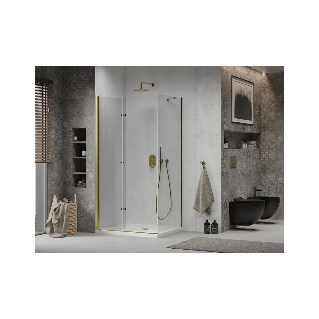 Skvelá voľba do každej kúpeľne. Elegantný sprchový kút je vyrobený z 6 mm hrubého tvrdeného skla v čírom prevedení. Aplikovaná povrchová úprava skla zaisťuje maximálny komfort všetkým užívateľom. Táto technológia zaručuje jedinečné vlastnosti zabraňujúce znečisteniu skla - povrch stačí iba opláchnuť vodou. Kút je uchytený v zlatých hliníkových profiloch a je vybavený tesnením zabraňujúcim úniku vody mimo sprchovací kút. Dvere sprchovacieho kúta sú skladacie (dve sklá spojená kvalitnými pánty s možnosťou zloženia dovnútra aj von). Na otváranie slúži decentné kovová rukoväť. Sprchovací kút je univerzálny - pri montáži si zvolíte otváranie doprava či doľava. Profilové lišty umožňujú reguláciu pre vyrovnanie prípadných nerovností stien.