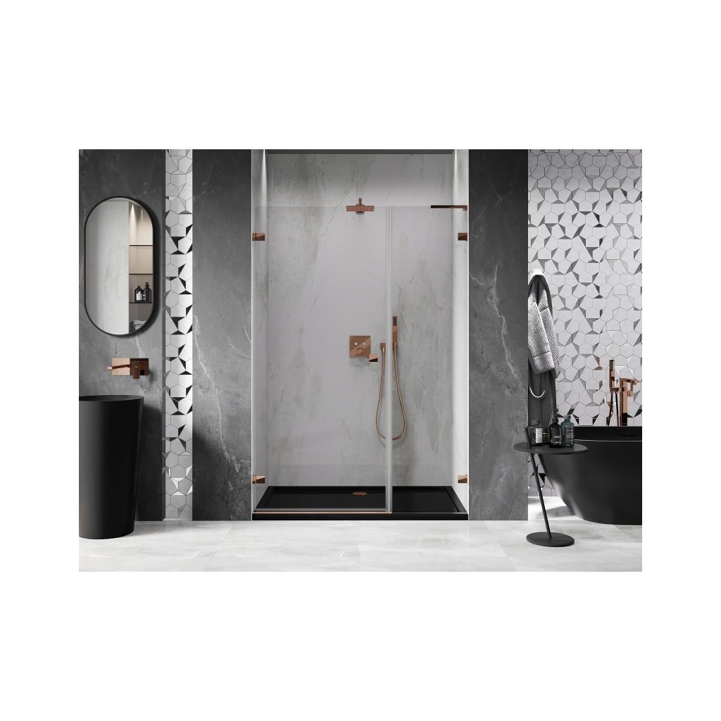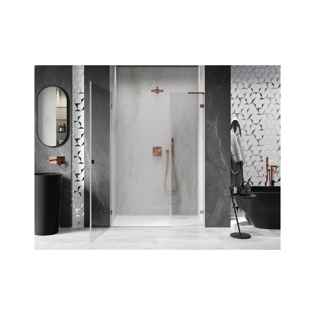 V konfigurácii viacerých rozmerov ponúka stabilnú konštrukciu a výklopné (krídlové) dvere. Tvrdené sklo s povrchom EasyClean zjednodušuje údržbu a profil v odtieni Ružové zlato zapadne do moderných kúpeľní.