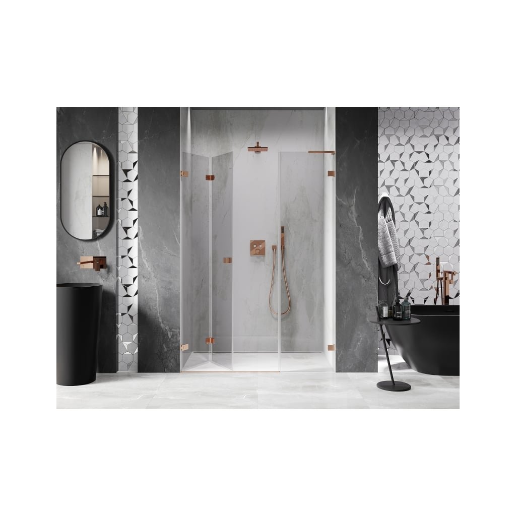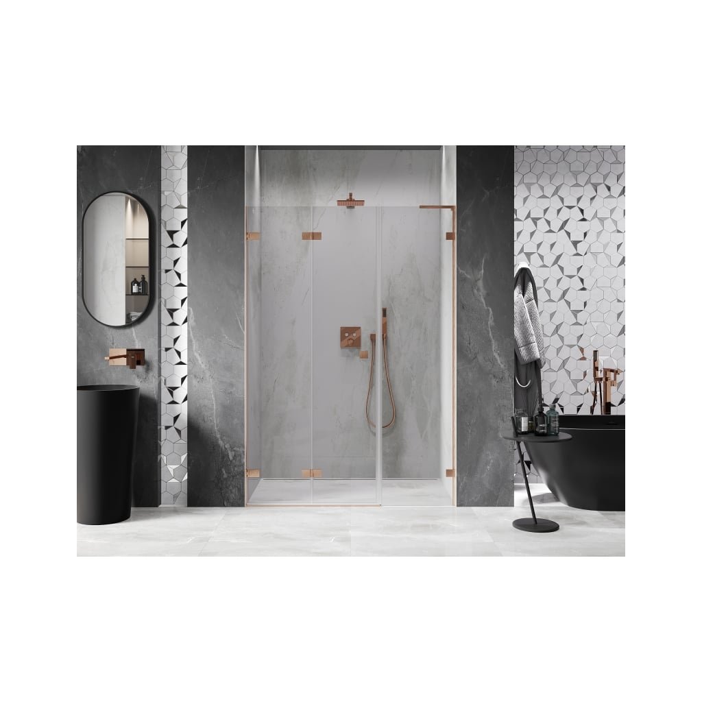 V konfigurácii viacerých rozmerov ponúka stabilnú konštrukciu a skladacie dvere. Tvrdené sklo s povrchom EasyClean zjednodušuje údržbu a profil v odtieni Brúsená meď zapadne do moderných kúpeľní.
