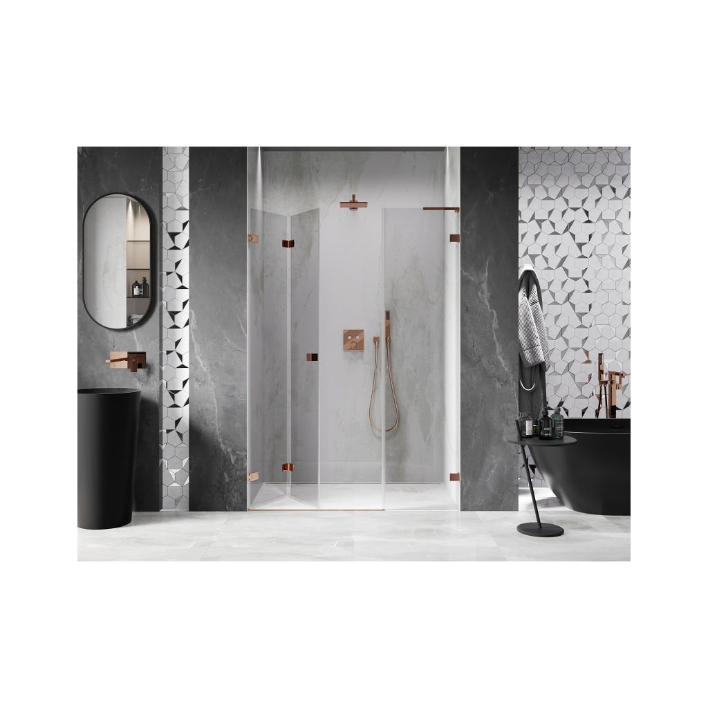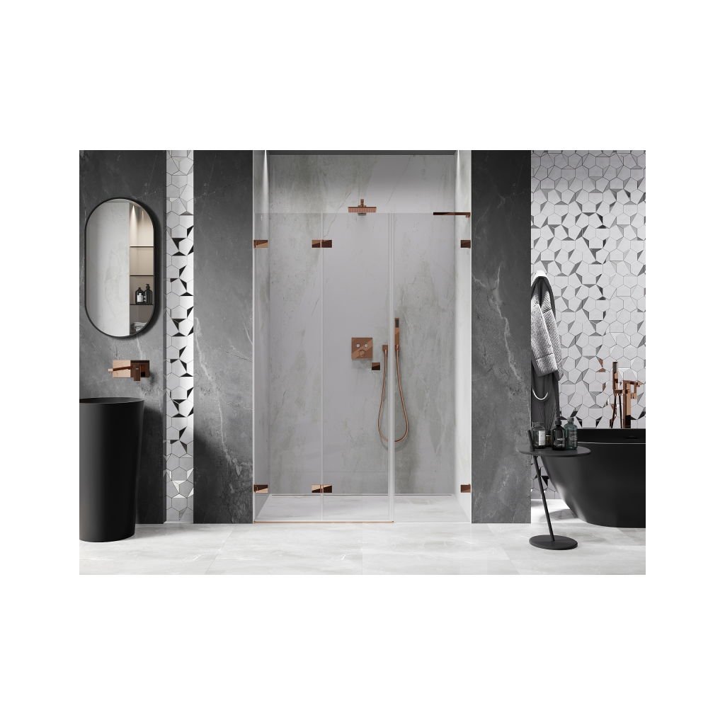 V konfigurácii viacerých rozmerov ponúka stabilnú konštrukciu a skladacie dvere. Tvrdené sklo s povrchom EasyClean zjednodušuje údržbu a profil v odtieni Ružové zlato zapadne do moderných kúpeľní.