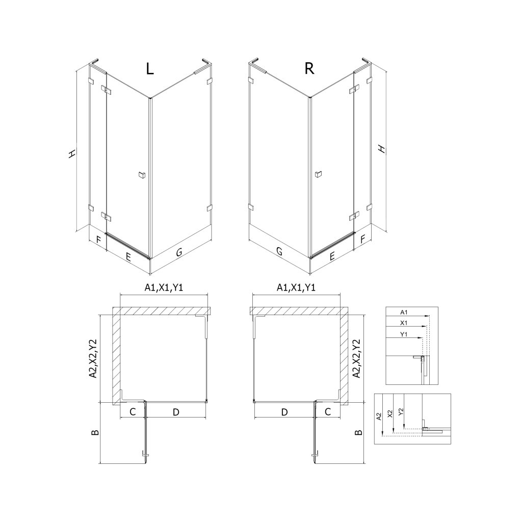 Rozmery: 100x100 cm (pravé dvere 100 cm, stena 100 cm)