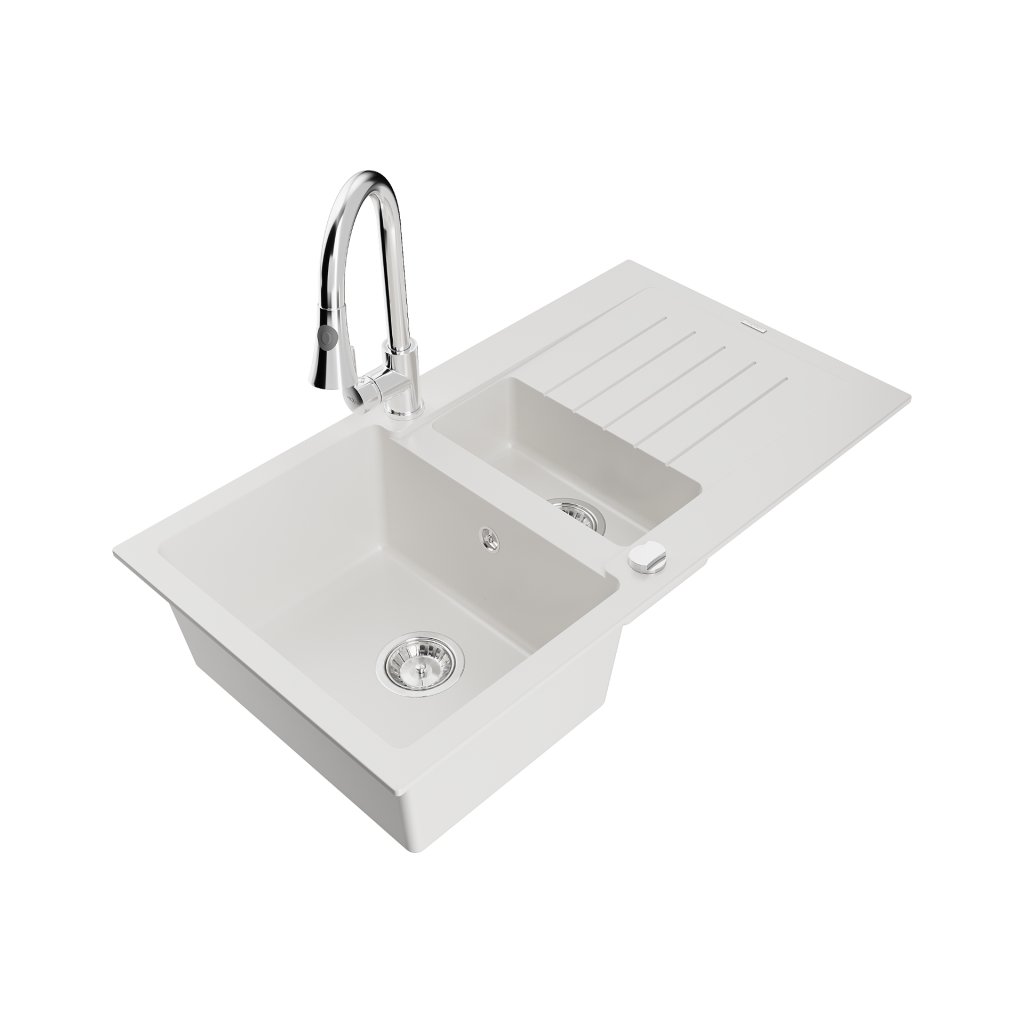 Mexen Matias, 1,5-komorový granitový drez 900x505x200 mm a drezová batéria Elia, biela, 6502-20-670101-00