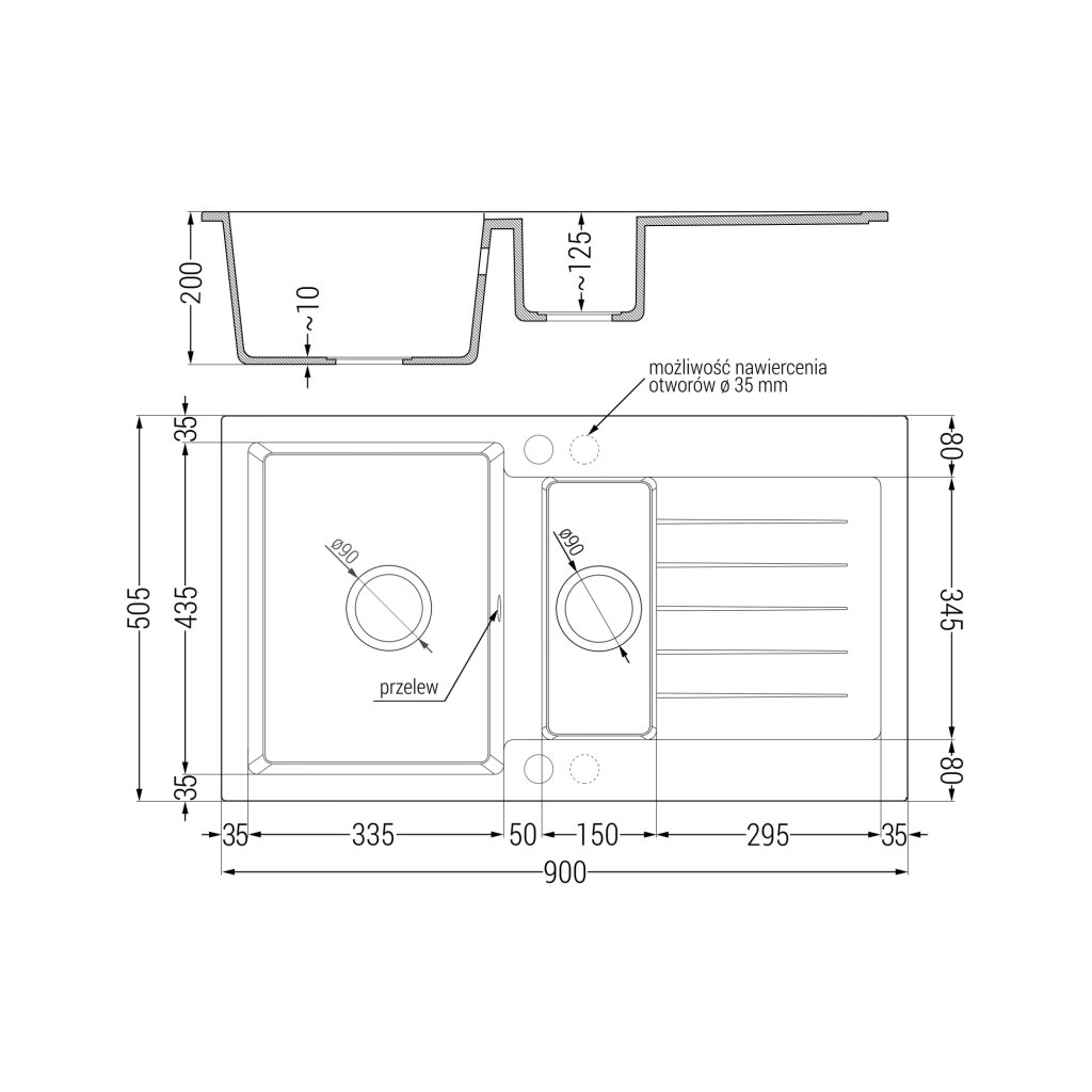 - Odtokový otvor: 3,5 ”;fi = 90 mm
