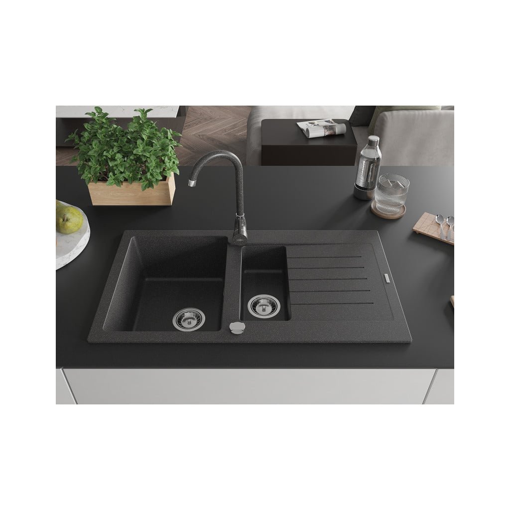 Mexen Matias, 1,5-komorový granitový drez s odkvapkávačom 90x50 cm a kuchynskou batériou Telma, čierna so sriebornými bodkami, 6502-76-670200-76