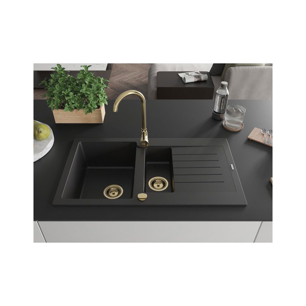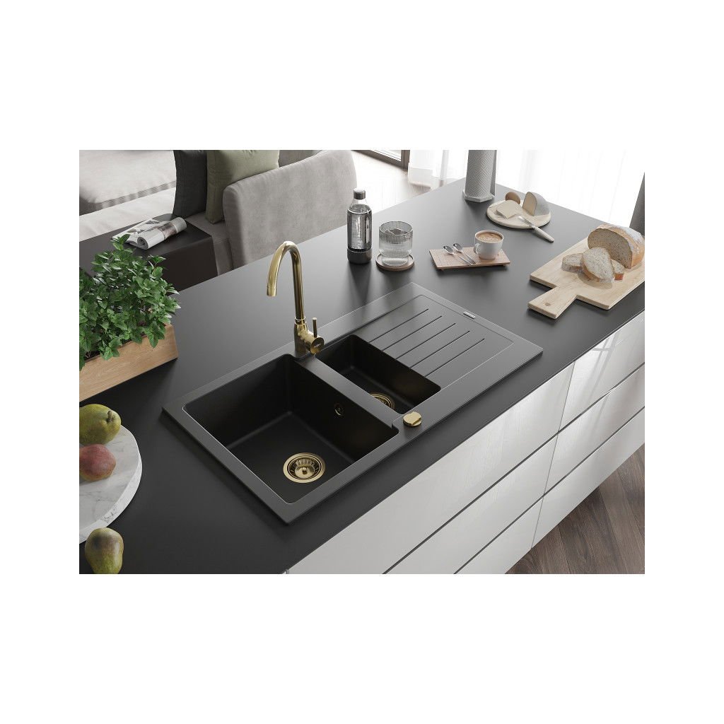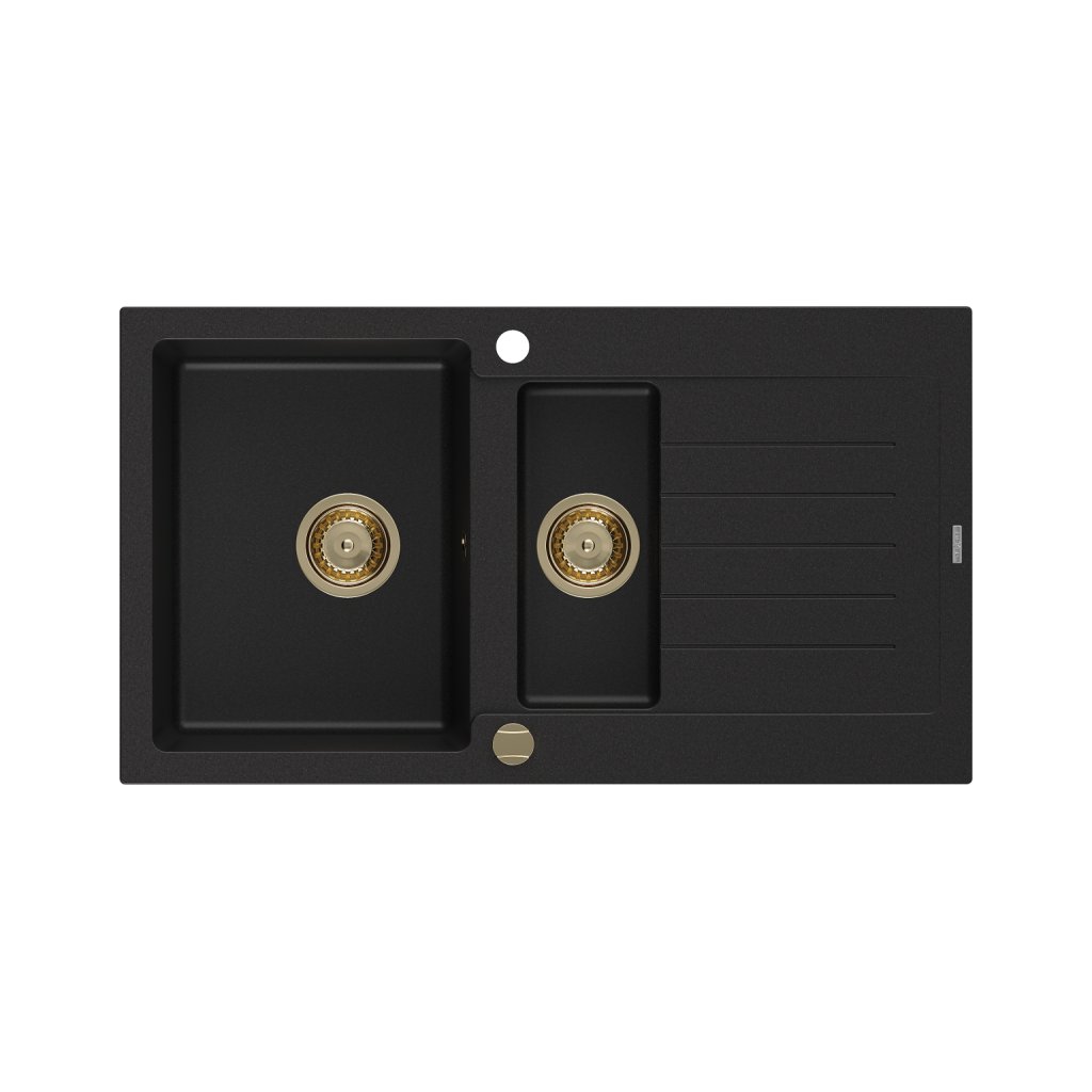 Mexen Matias - drez granitový 900x505x200 mm, 1,5-komorový, čierna so zlatým sifónom, 6502901505-77-G