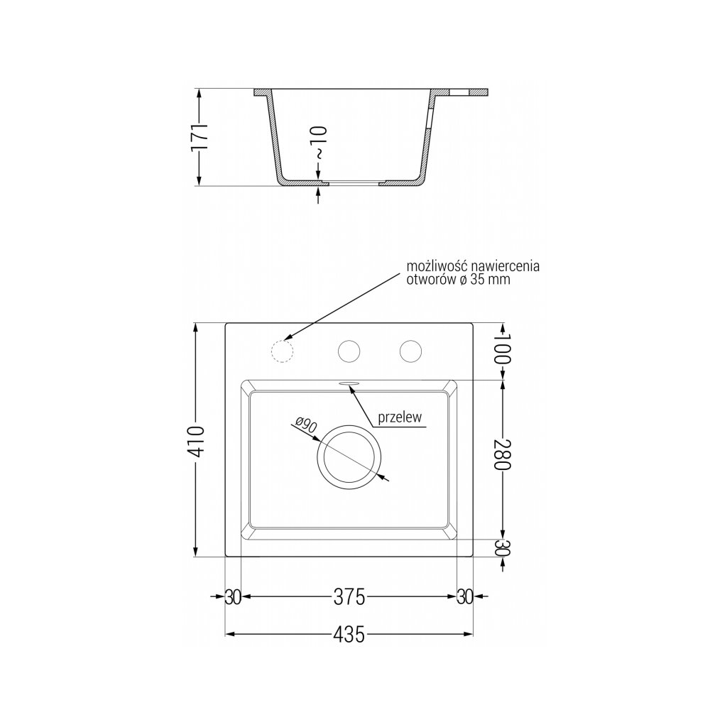 - Odtokový otvor: 3,5 ”;fi = 90 mm