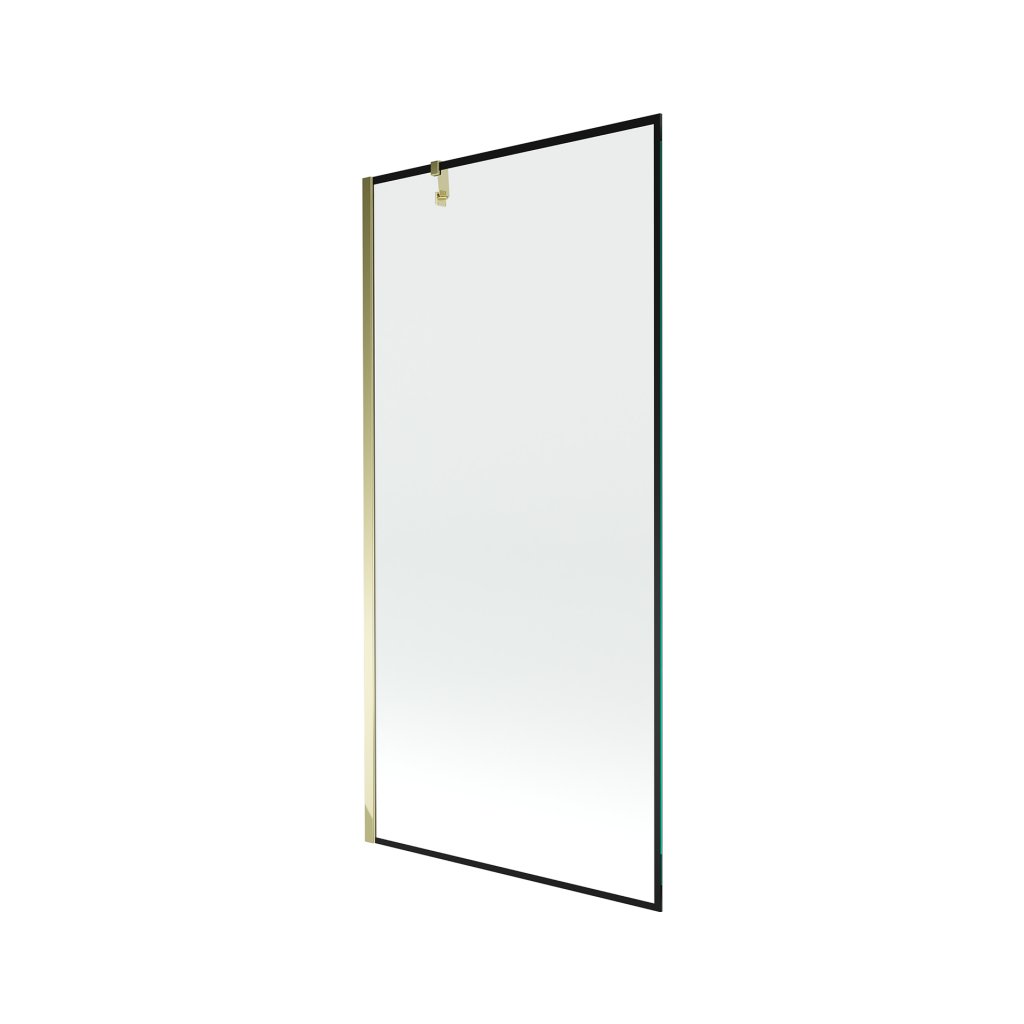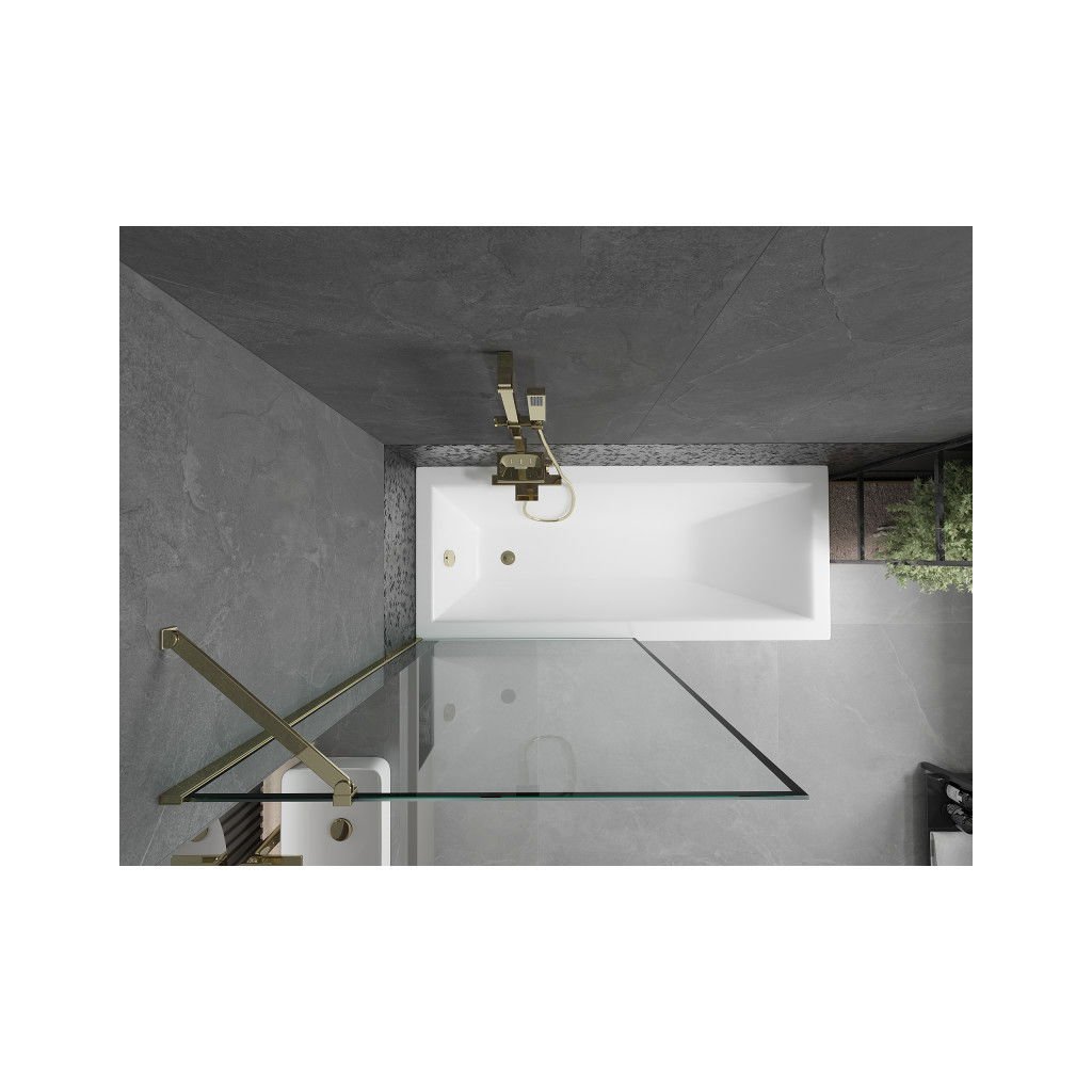 Mexen Next, vaňová zástena 1-krídlová 100 x 150 cm, fixné krídlo, 6 mm číre sklo s čiernym vzorom, zlatý profil, 895-100-000-00-70-50