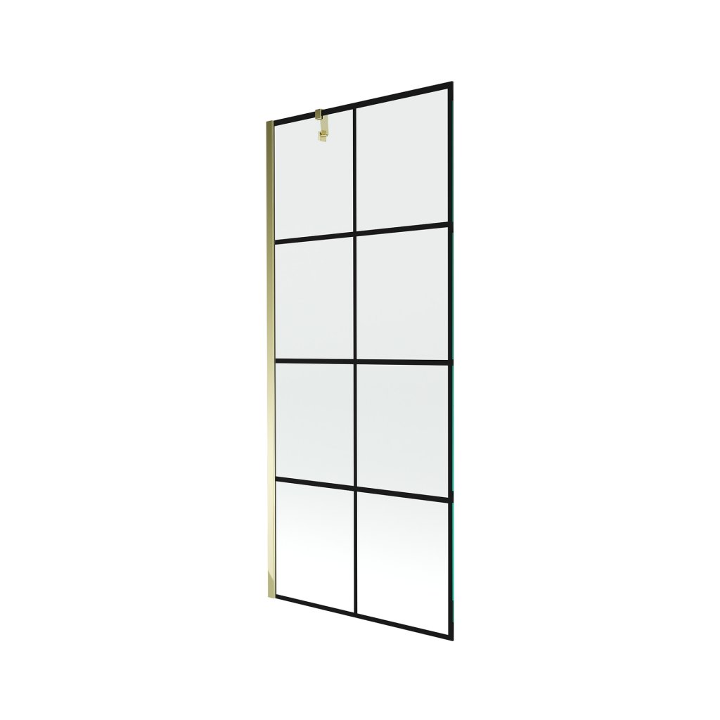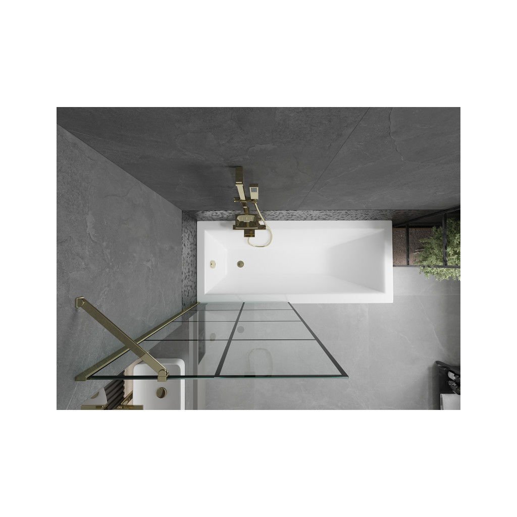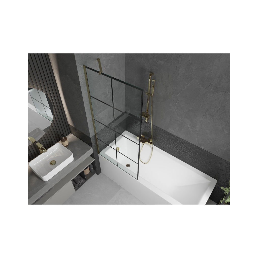 Mexen Next, vaňová zástena 1-krídlová 80 x 150 cm, fixné krídlo, 6 mm číre sklo s čiernym vzorom, zlatý profil, 895-080-000-00-77-50
