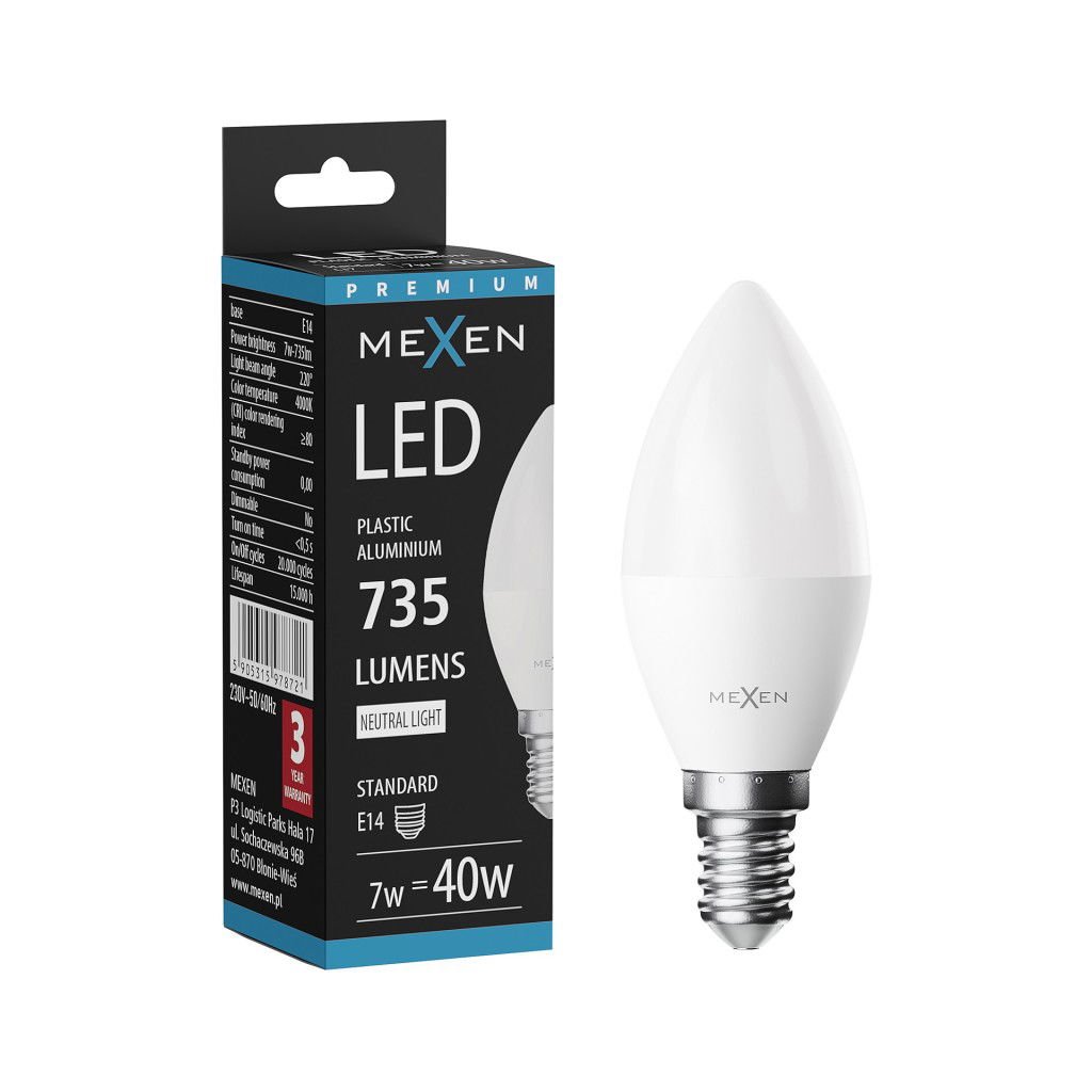 Mexen Nova, LED žiarovka E14, C37, 7W, teplá - 3000K, 735 lm - L102-E14-0730-01