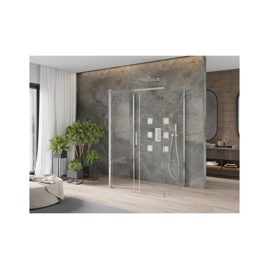 Skvelá voľba do každej kúpeľne. Exkluzívny sprchovací kút je vyrobený z 8 mm hrubého tvrdeného skla v čírom prevedení. Aplikovaná povrchová úprava skla (Easy-Clean) zaisťuje maximálny komfort všetkým užívateľom. Táto technológia zaručuje jedinečné vlastnosti zabraňujúce znečisteniu skla - povrch stačí iba opláchnuť vodou. Kút je uchytený v chrómovaných hliníkových profiloch a je vybavený tesnením zabraňujúcim úniku vody mimo sprchovací kút. Dvere sprchovacieho kúta sú posuvné (pojazdy s kvalitnými odolnými kolieskami). Na otváranie slúži elegantná kovová rukoväť.