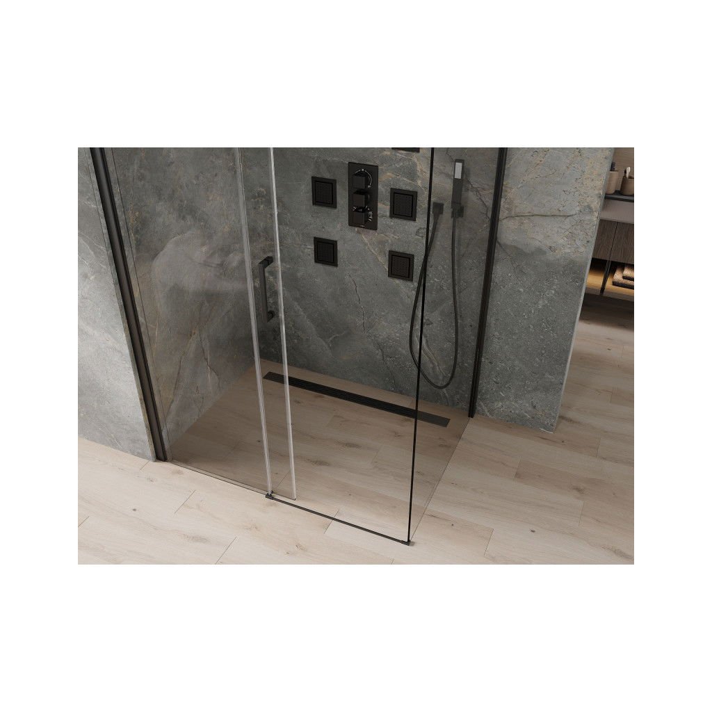 Mexen Omega, sprchovací kút s posuvnými dverami 130 (dvere) x 100 (stena) cm, 8mm sklo, čierny profil-číre sklo, 825-130-100-70-00