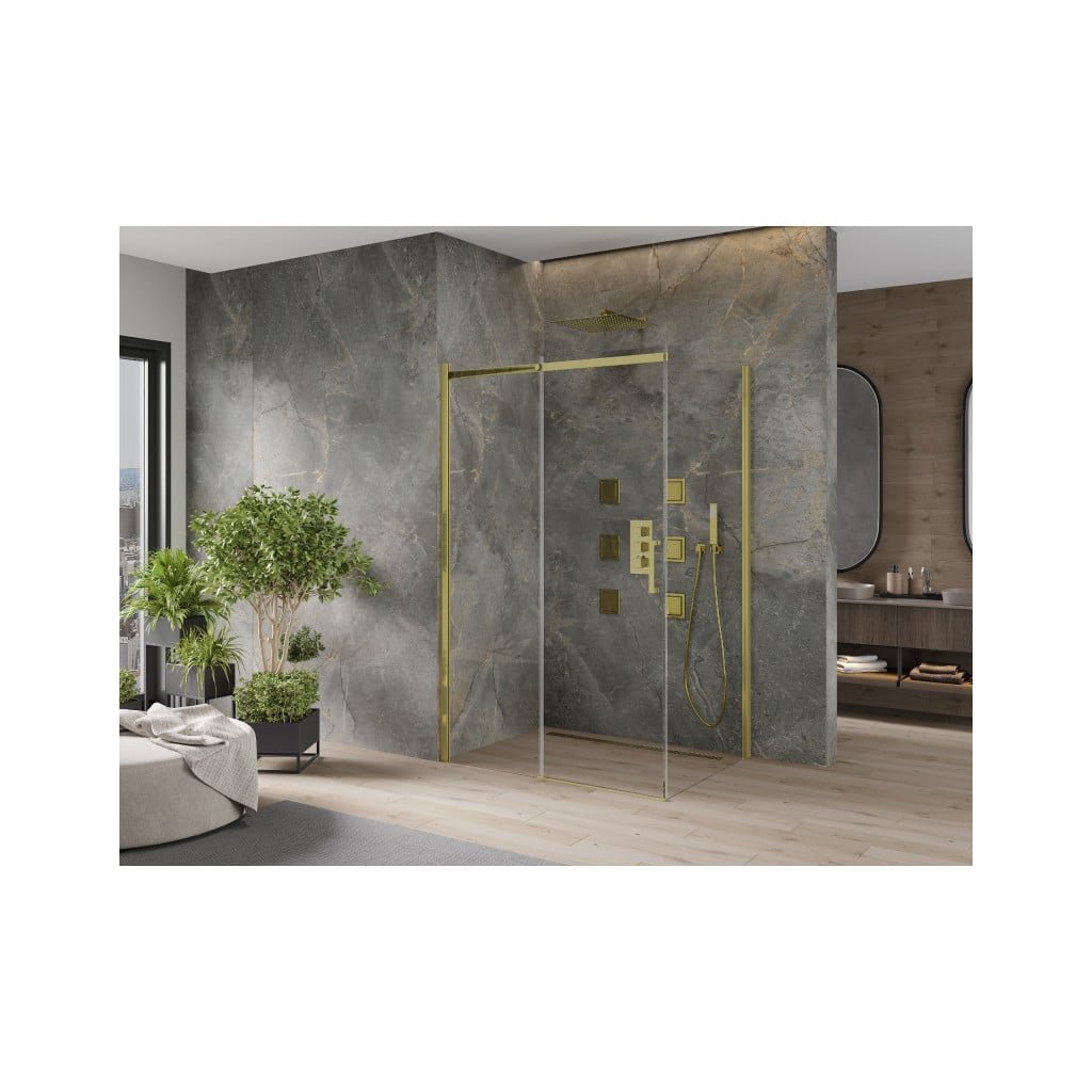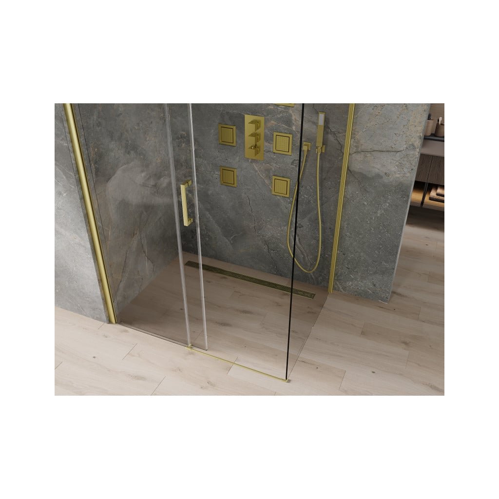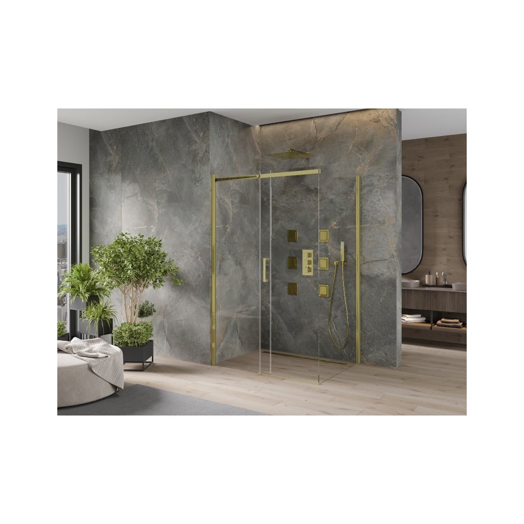 Mexen Omega, sprchovací kút s posuvnými dverami 130 (dvere) x 90 (stena) cm, 8mm sklo, zlatý profil-číre sklo, 825-130-090-50-00