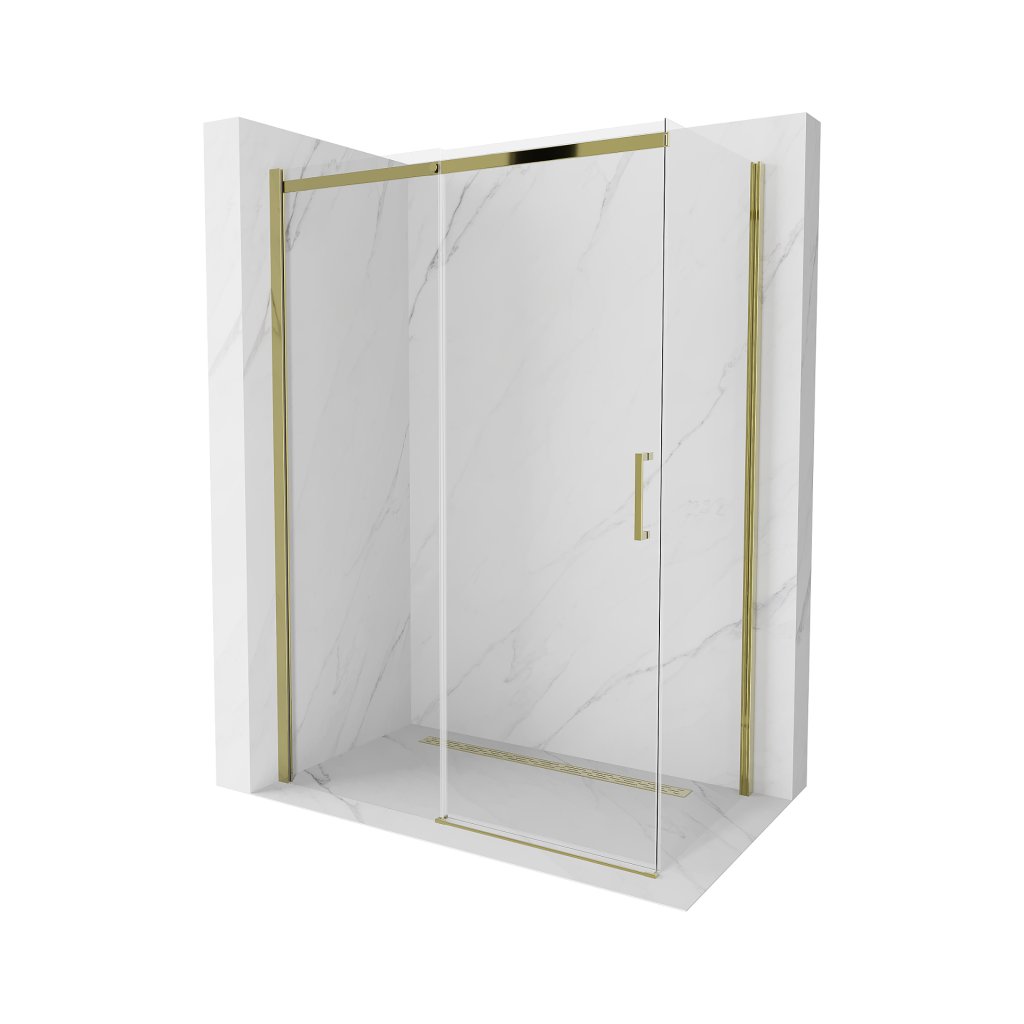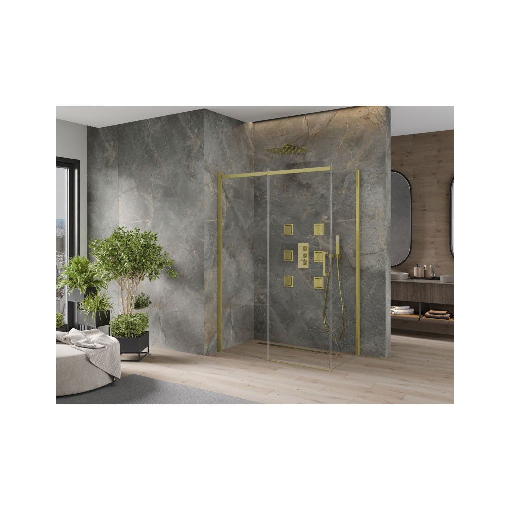 Mexen Omega, sprchovací kút s posuvnými dverami 140 (dvere) x 80 (stena) cm, 8mm sklo, zlatý profil-číre sklo, 825-140-080-50-00