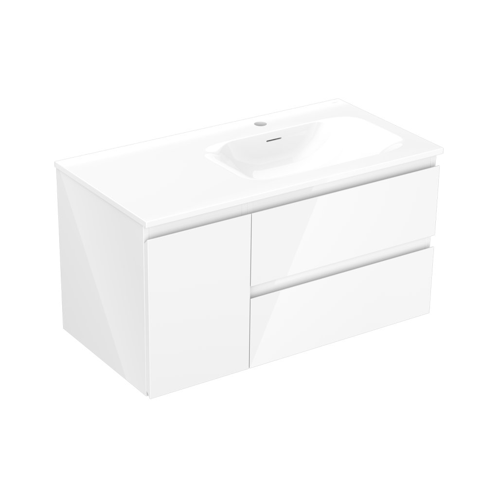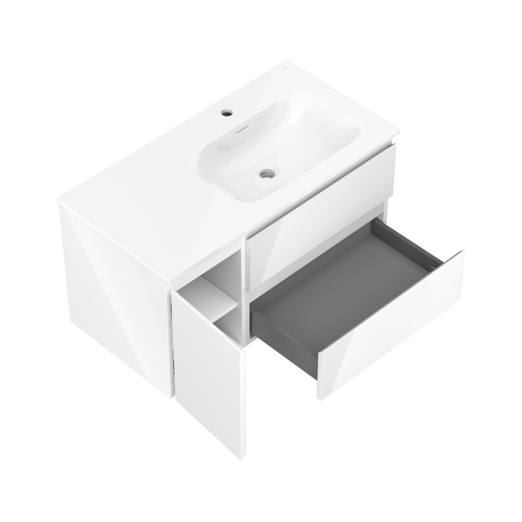 Mexen Orio, kúpeľňová skrinka 90 cm s pravým umývadlom Vela, 2S, 1D, biela lesklá, 91A13-09047-3-BBFFF00-W23P00