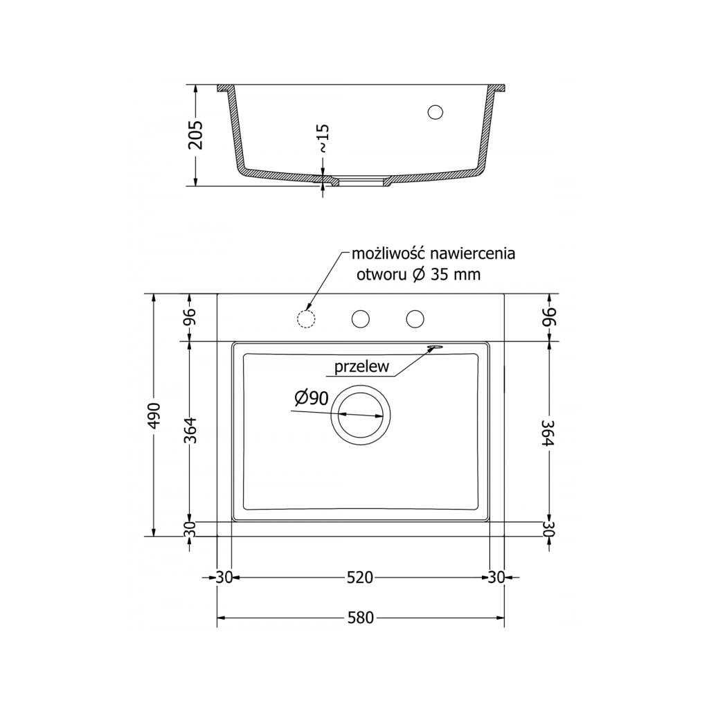 - Počet vyvŕtaných otvorov vo výrobe: 2 (1 x drezová batérie, 1 x automatické ovládanie odtokovej zátky)