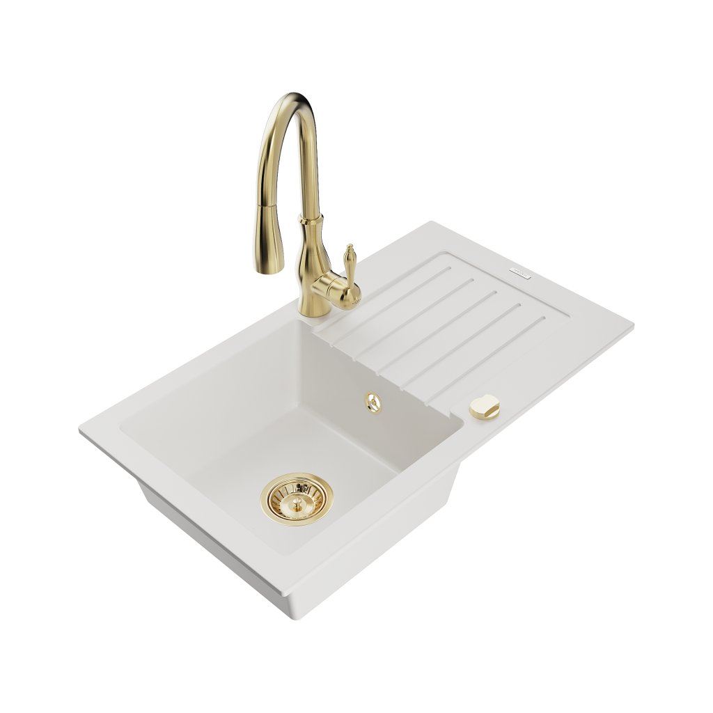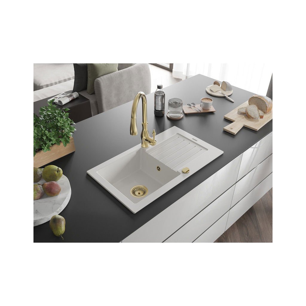 Mexen Pablo, 1-komorový granitový drez 752x436x161 mm a drezová batéria Savita, biela, 6510-20-672601-50