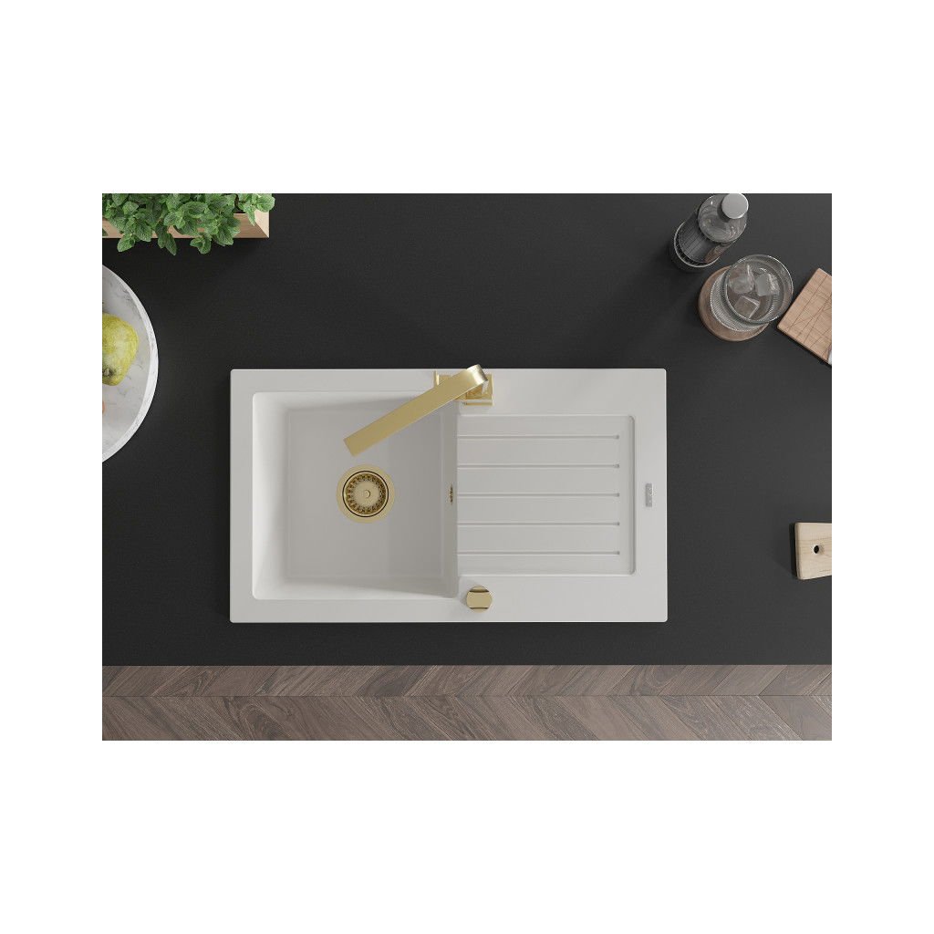 Mexen Pablo, granitový drez 752x436x161 mm, 1-komorový a zlatá batéria Rita, biela, 6510-20-670300-50