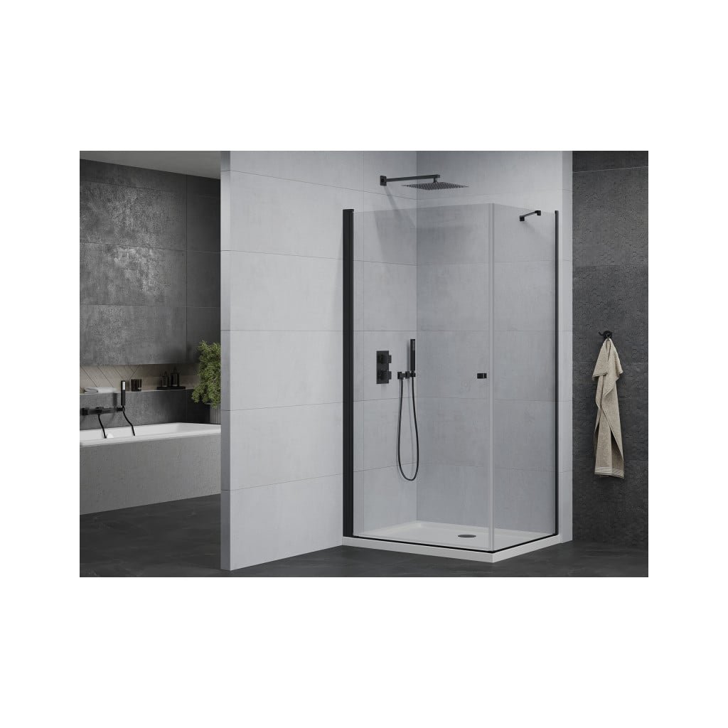 Elegantný sprchovací kút je vyrobený zo 6 mm hrubého tvrdeného skla v prechode procedúry. Aplikovaná povrchová úprava skla zaisťuje maximálny komfort všetkým užívateľom. Táto technológia zaručuje jedinečné vlastnosti, aby sa zabránilo kontaminácii skla - povrch stačí len opláchnuť vodou. Kút je osadený v čiernych hliníkových profiloch a je vybavený tesnením, ktoré zabraňuje úniku vody mimo sprchy kút. Dvere sprchovacieho kúta sú krídlové s možnosťou otvárania dovnútra alebo von (nutné zvoliť pri montáži). Na otváranie slúži decentné kovová rukoväť. Dokonalú stabilitu sprchovacieho kúta zaisťuje kotviace rameno, ktoré je súčasťou produktu. Sprchovací kút je univerzálny - pri inštalácii sa rozhodnete otvoriť vpravo alebo doľava. Profilové lišty umožňujú reguláciu pre vyrovnanie prípadných drobných nerovností stien. Sprchovací kút je možné inštalovať na sprchovú vaničku alebo priamo na dlažbu.