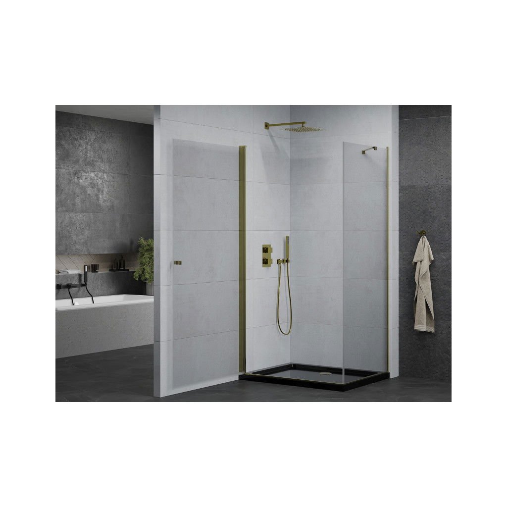 Elegantný sprchovací kút je vyrobený zo 6 mm hrubého tvrdeného skla v prechode procedúry. Aplikovaná povrchová úprava skla zaisťuje maximálny komfort všetkým užívateľom. Táto technológia zaručuje jedinečné vlastnosti, aby sa zabránilo kontaminácii skla - povrch stačí len opláchnuť vodou. Kút je osadený v zlatých hliníkových profiloch a je vybavený tesnením, ktoré zabraňuje úniku vody mimo sprchy kút. Dvere sprchovacieho kúta sú krídlové s možnosťou otvárania dovnútra alebo von (nutné zvoliť pri montáži). Na otváranie slúži decentné kovová rukoväť. Dokonalú stabilitu sprchovacieho kúta zaisťuje kotviace rameno, ktoré je súčasťou produktu. Sprchovací kút je univerzálny - pri inštalácii sa rozhodnete otvoriť vpravo alebo doľava. Profilové lišty umožňujú reguláciu pre vyrovnanie prípadných drobných nerovností stien. Sprchovací kút je možné inštalovať na sprchovú vaničku alebo priamo na dlažbu.