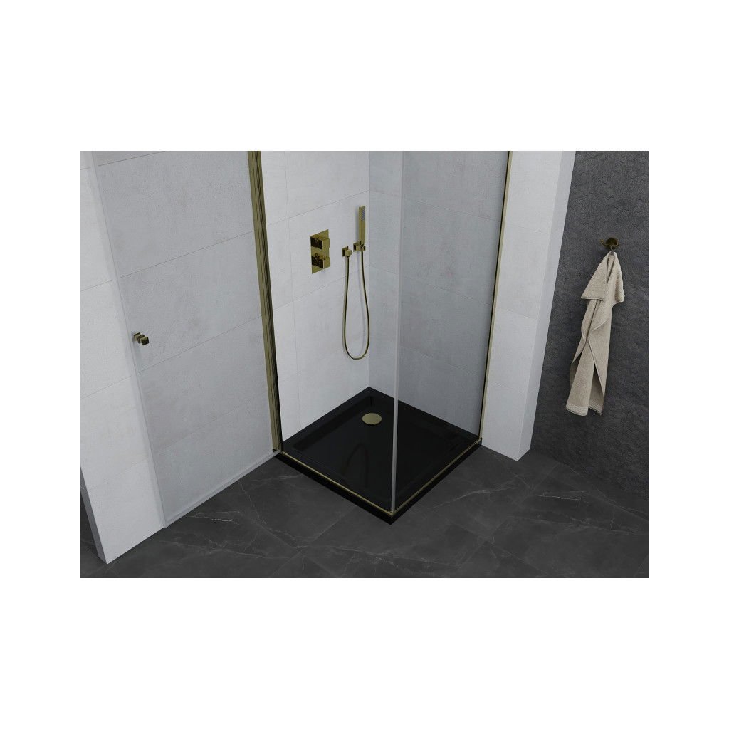 Mexen Pretoria, sprchovací kút 90 (dvere) x 90 (stena) cm, 6mm číre sklo, zlatý profil + čierna sprchová vanička, 852-090-090-50-00-4070G