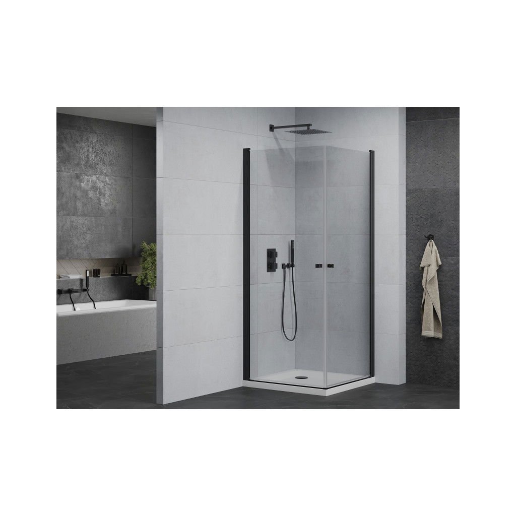 Mexen Pretoria Duo, sprchovací kút s 2-krídlovými dverami 70 (dvere) x 70 (dvere) cm, 6mm číre sklo, čierny profil + slim sprchová vanička 5cm biela s čiernym sifónom, 852-070-070-70-02-4010B