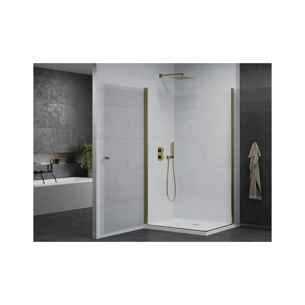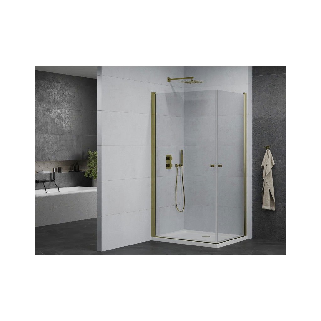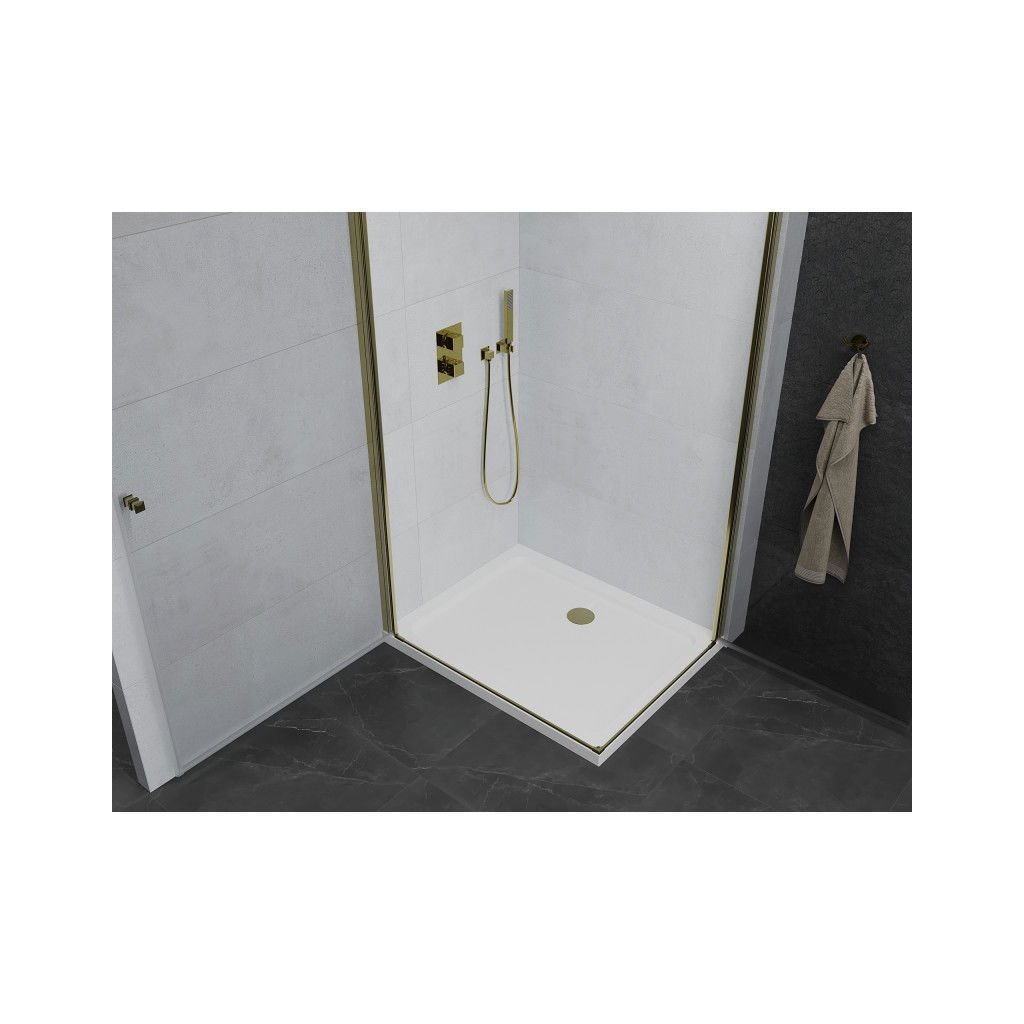 Mexen Pretoria Duo, sprchovací kút s 2-krídlovými dverami 80 (dvere) x 70 (dvere) cm, 6mm číre sklo, zlatý profil + slim sprchová vanička 5cm biela so zlatým sifónom, 852-080-070-50-02-4010G