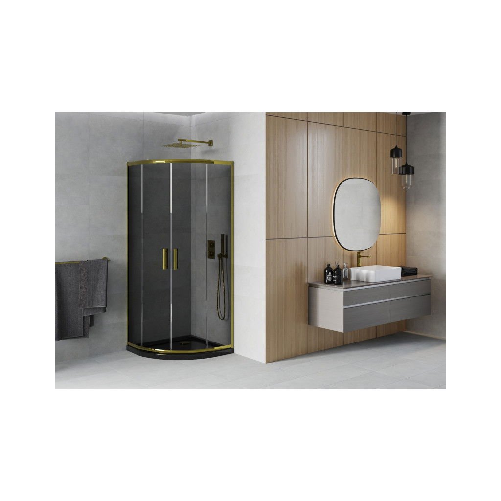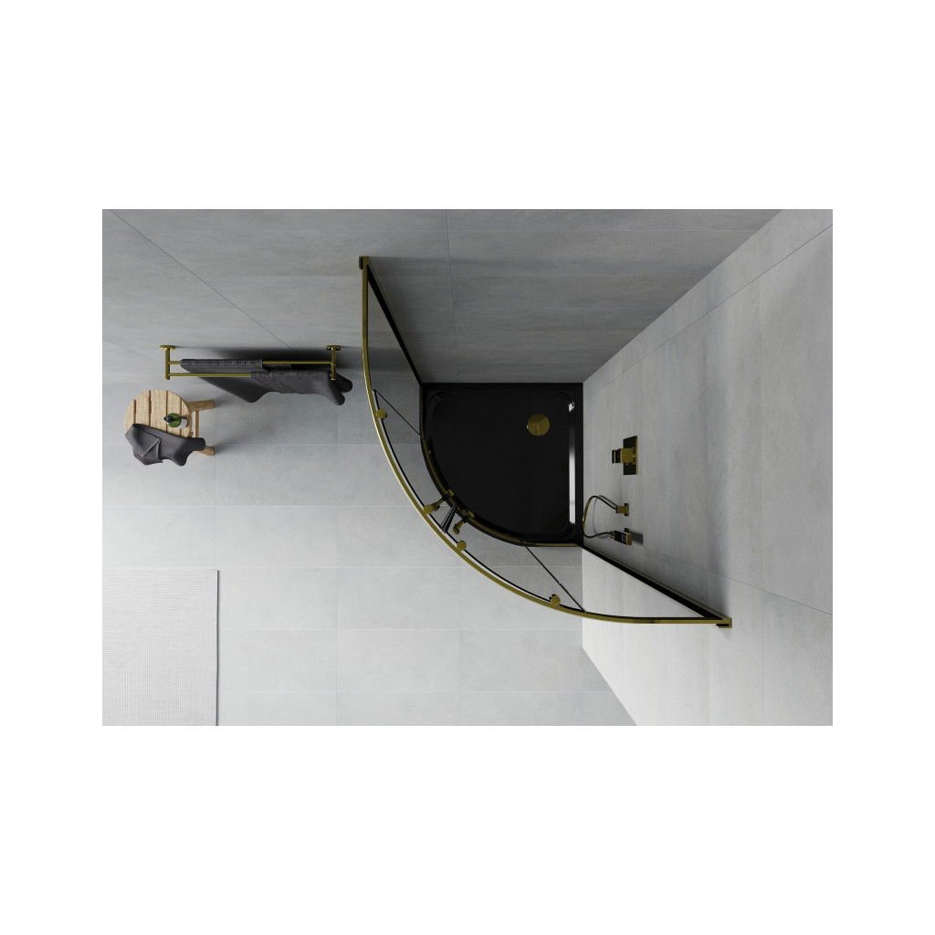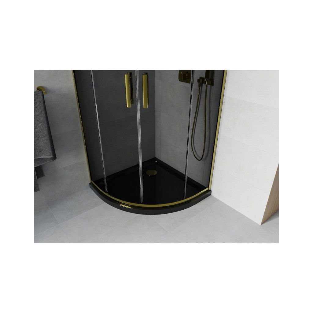 Mexen Rio, štvrťkruhový sprchovací kút s posuvnými dverami 80 (dvere) x 80 (dvere) x 190 cm, 6mm šedé sklo, zlatý profil + čierna sprchová vanička SLIM, 863-080-080-50-40-4170G