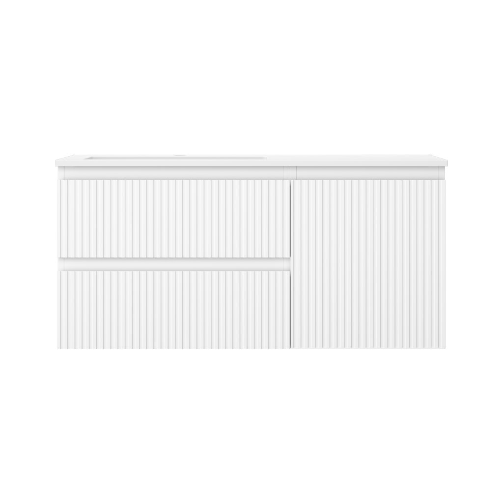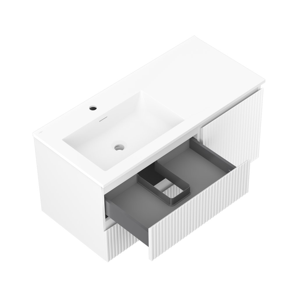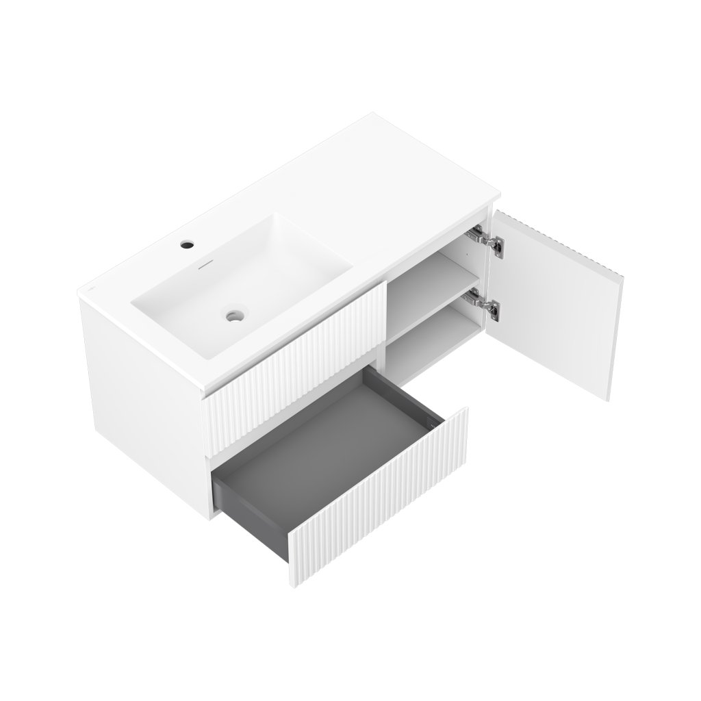 Mexen Rivel, kúpeľňová skrinka 100 cm s ľavým umývadlom Otis, 2S, 1D, drážkovaná, biela matná, 91A23-10047-3-BBFFF01-W18L01