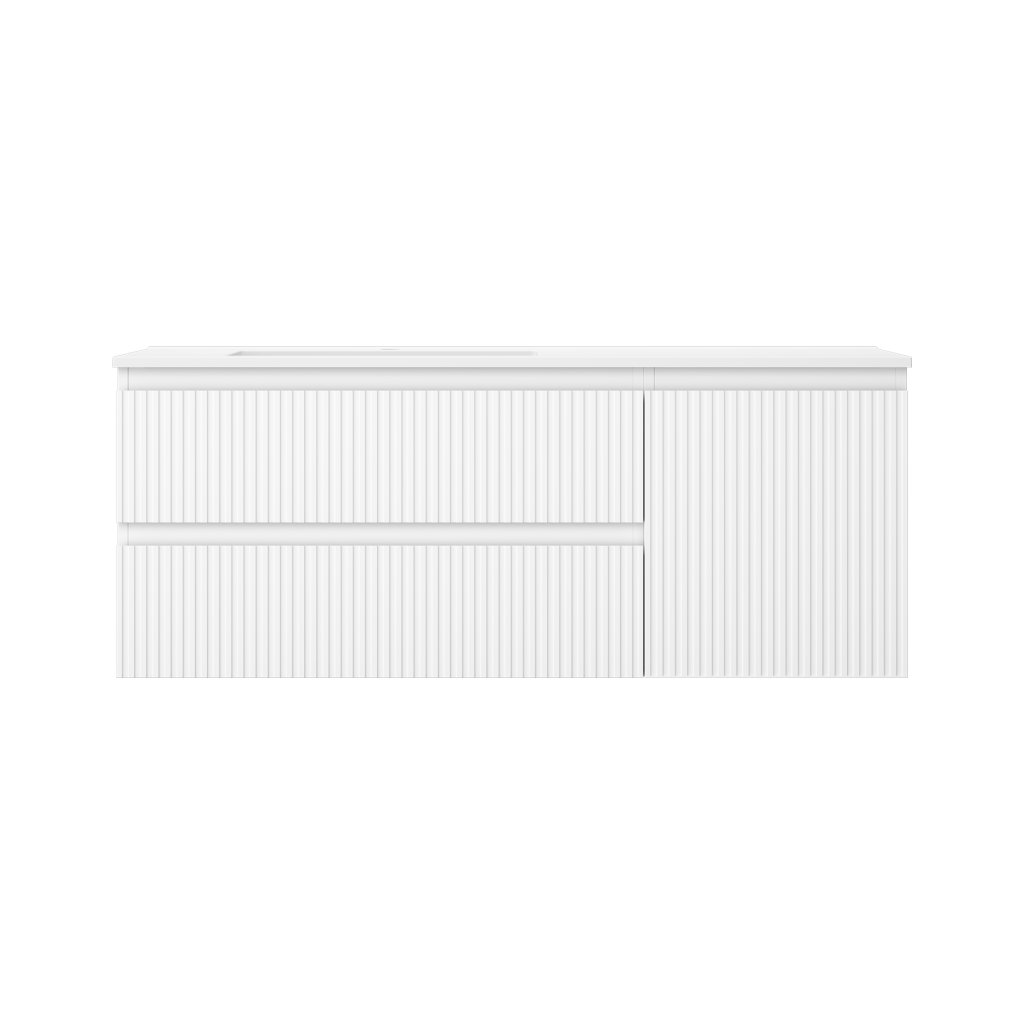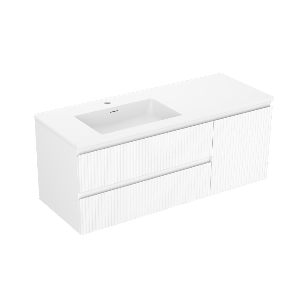 Mexen Rivel, kúpeľňová skrinka 120 cm s ľavým umývadlom Otis, 2S, 1D, drážkovaná, biela matná, 91A23-12047-3-BBFFF01-W18L01