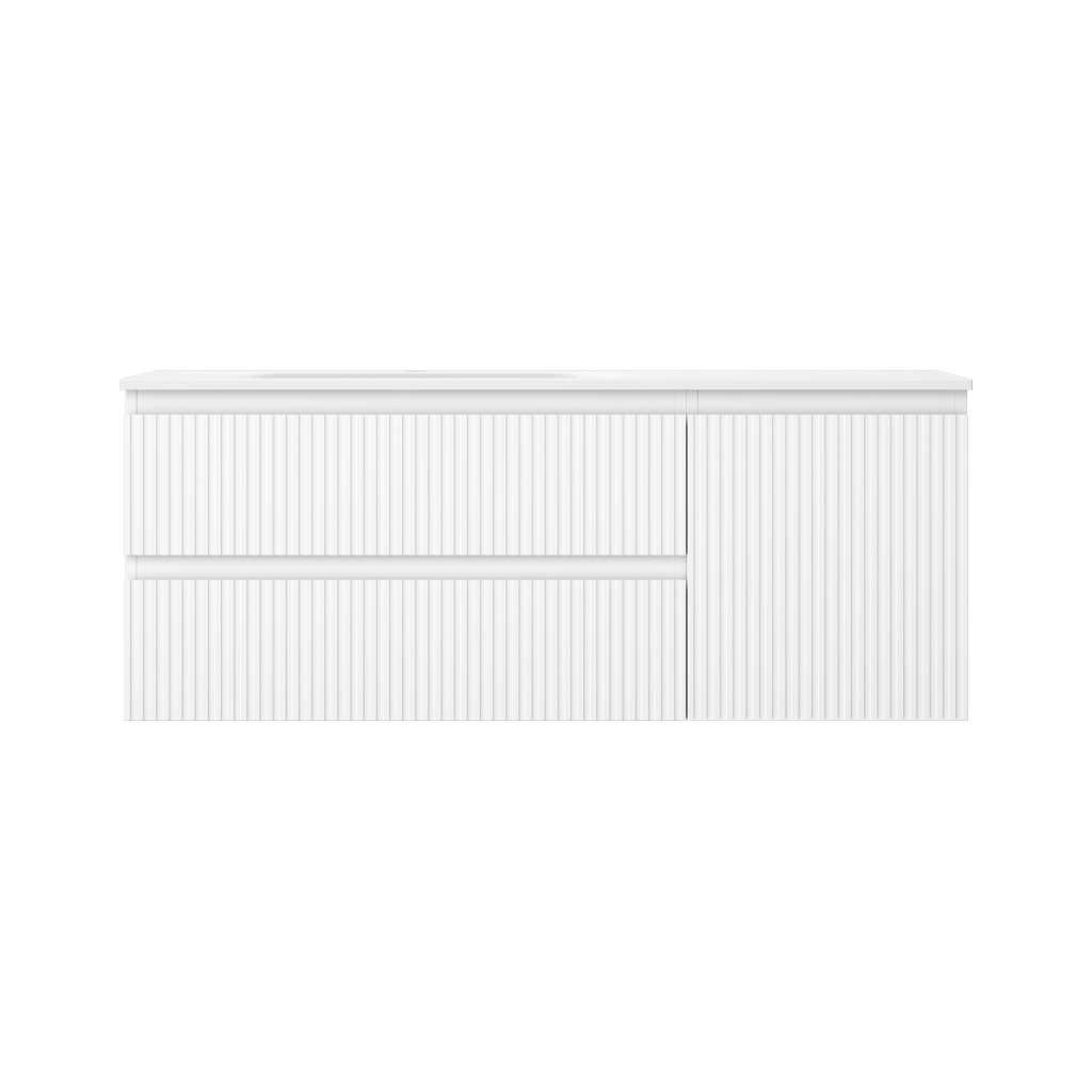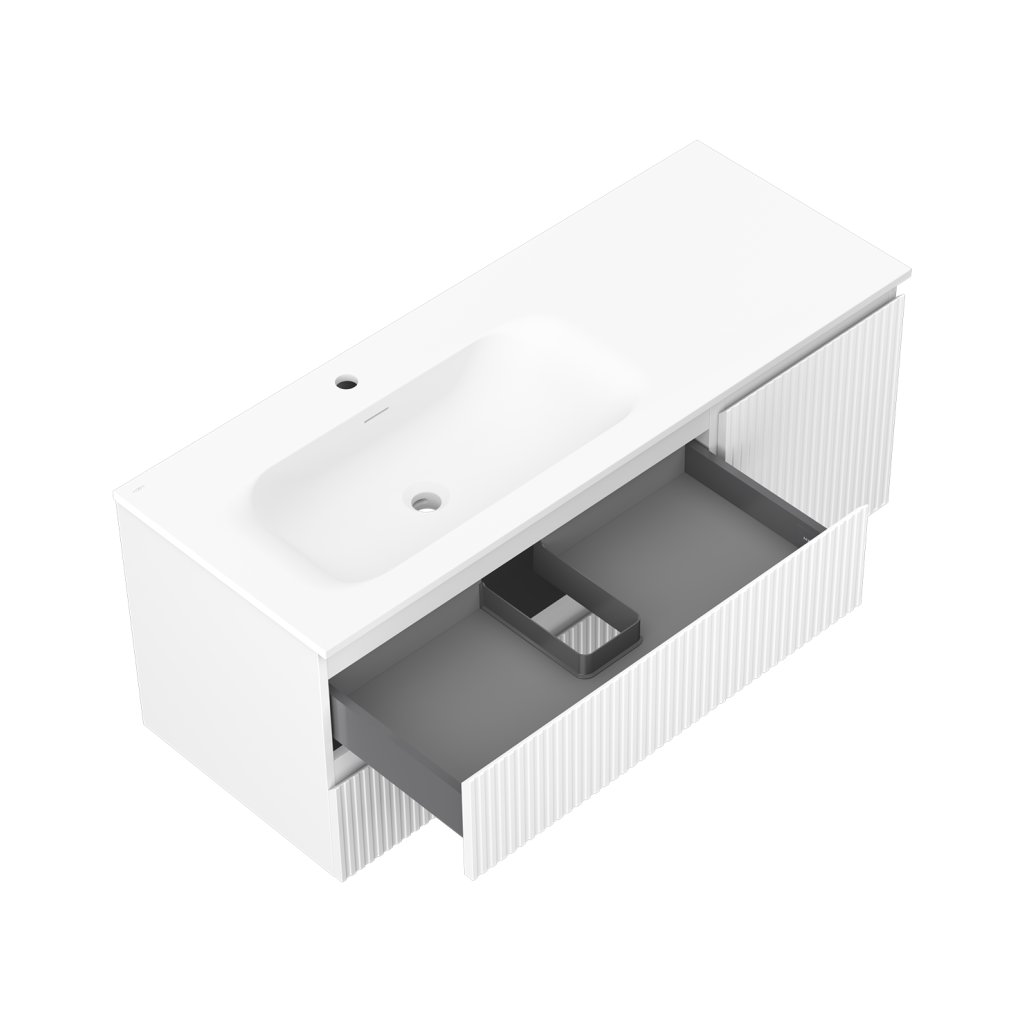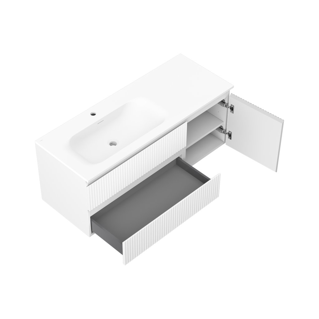 Mexen Rivel, kúpeľňová skrinka 120 cm s ľavým umývadlom Vela, 2S, 1D, drážkovaná, biela matná, 91A23-12047-3-BBFFF01-W23L01