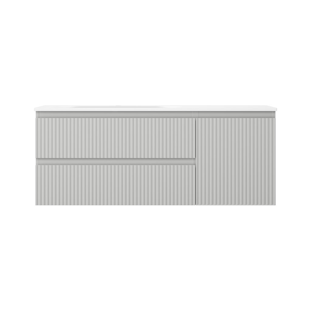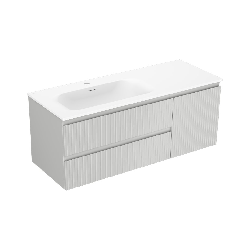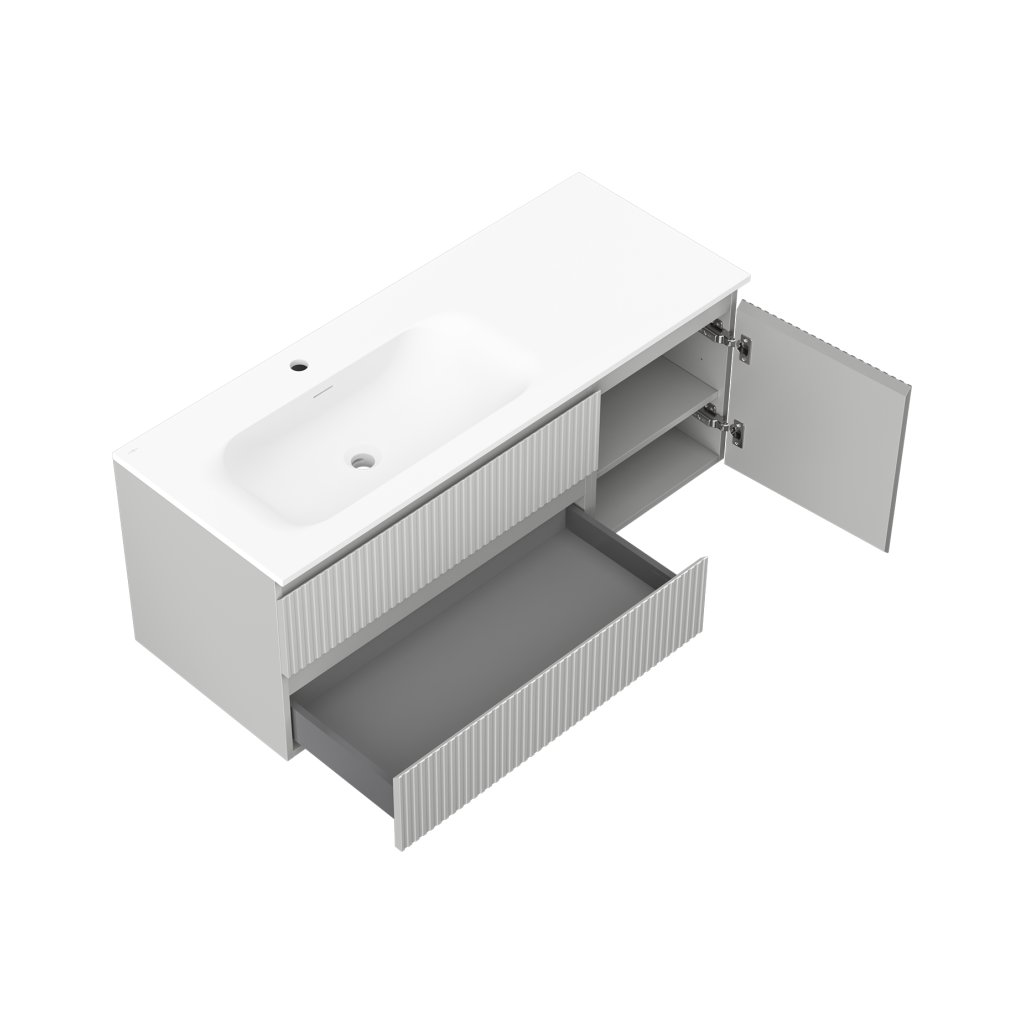 Mexen Rivel, kúpeľňová skrinka 120 cm s umývadlom Vela vľavo, 2S, 1D, drážkovaná, sivá matná/biela matná - 91A23-12047-3-BBFFF62-W23L01