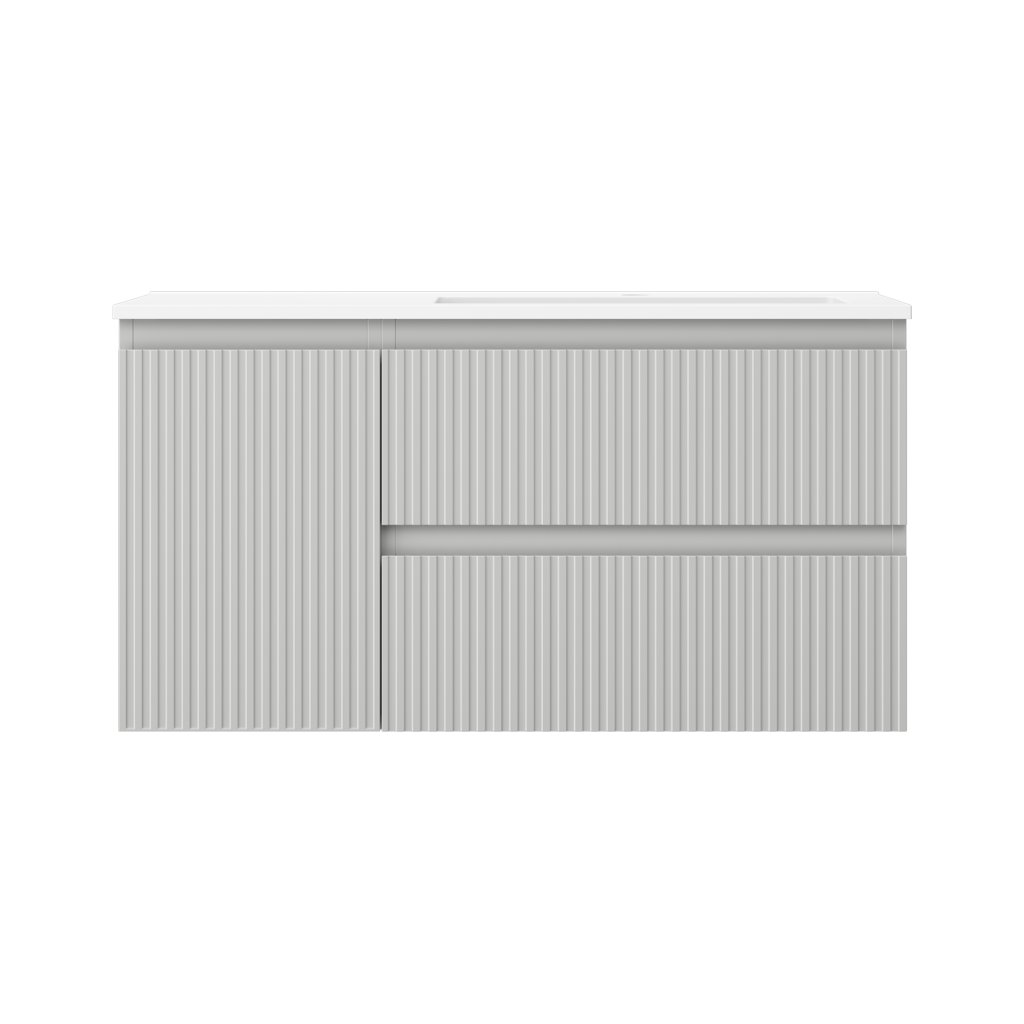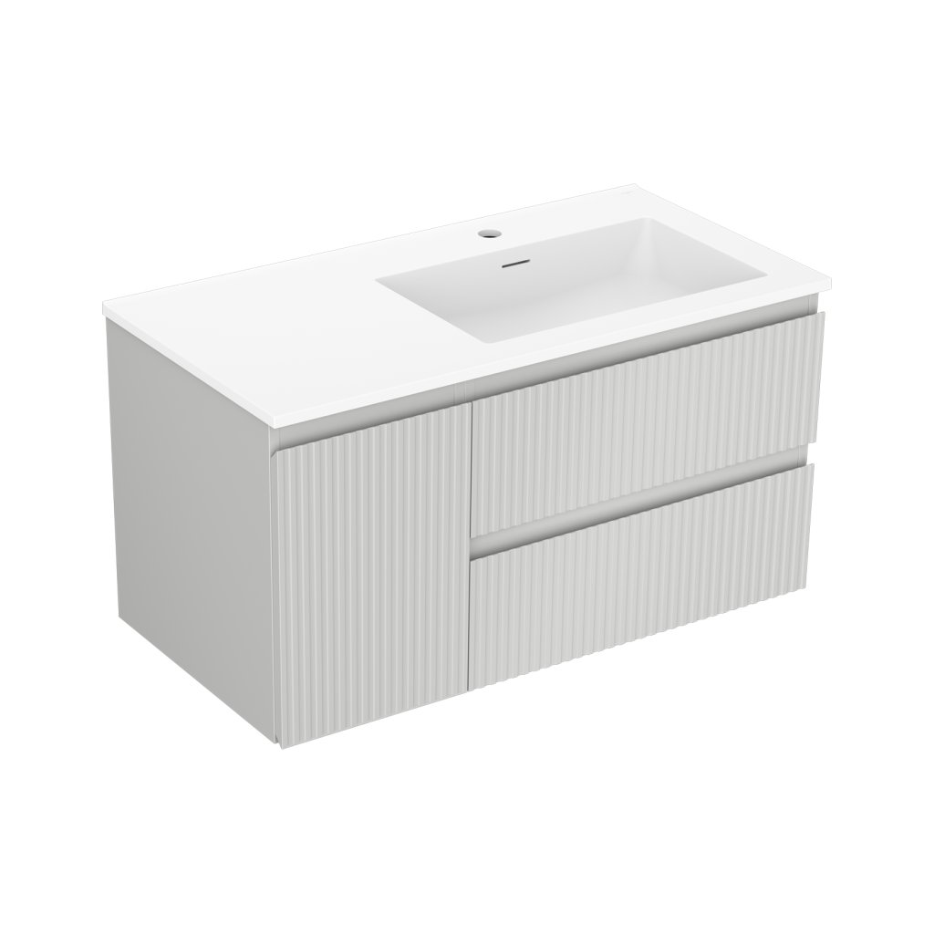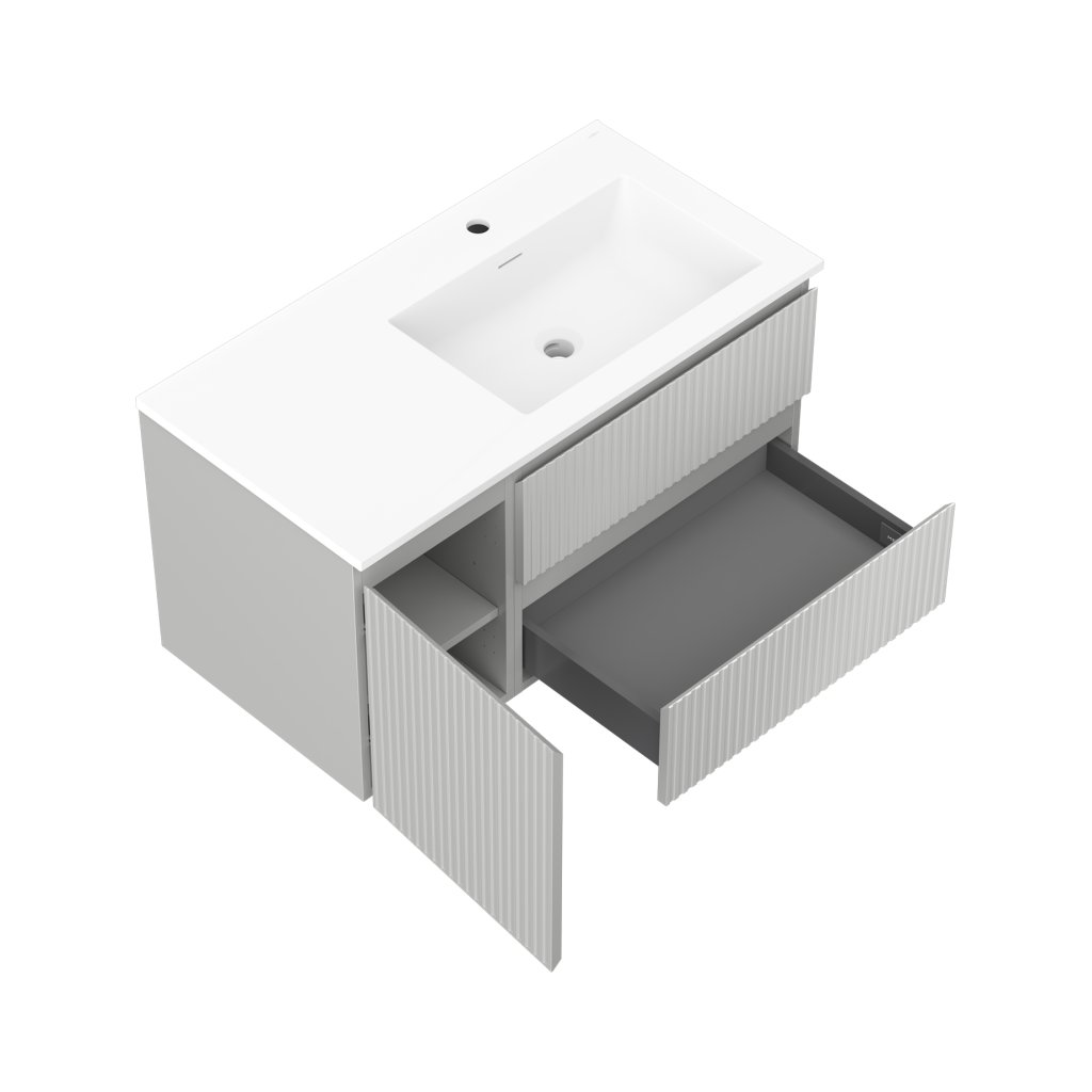 Mexen Rivel, kúpeľňová skrinka 90 cm s pravým umývadlom Otis, 2S, 1D, drážkovaná, sivá matná/biela matná - 91A23-09047-3-BBFFF62-W18P01