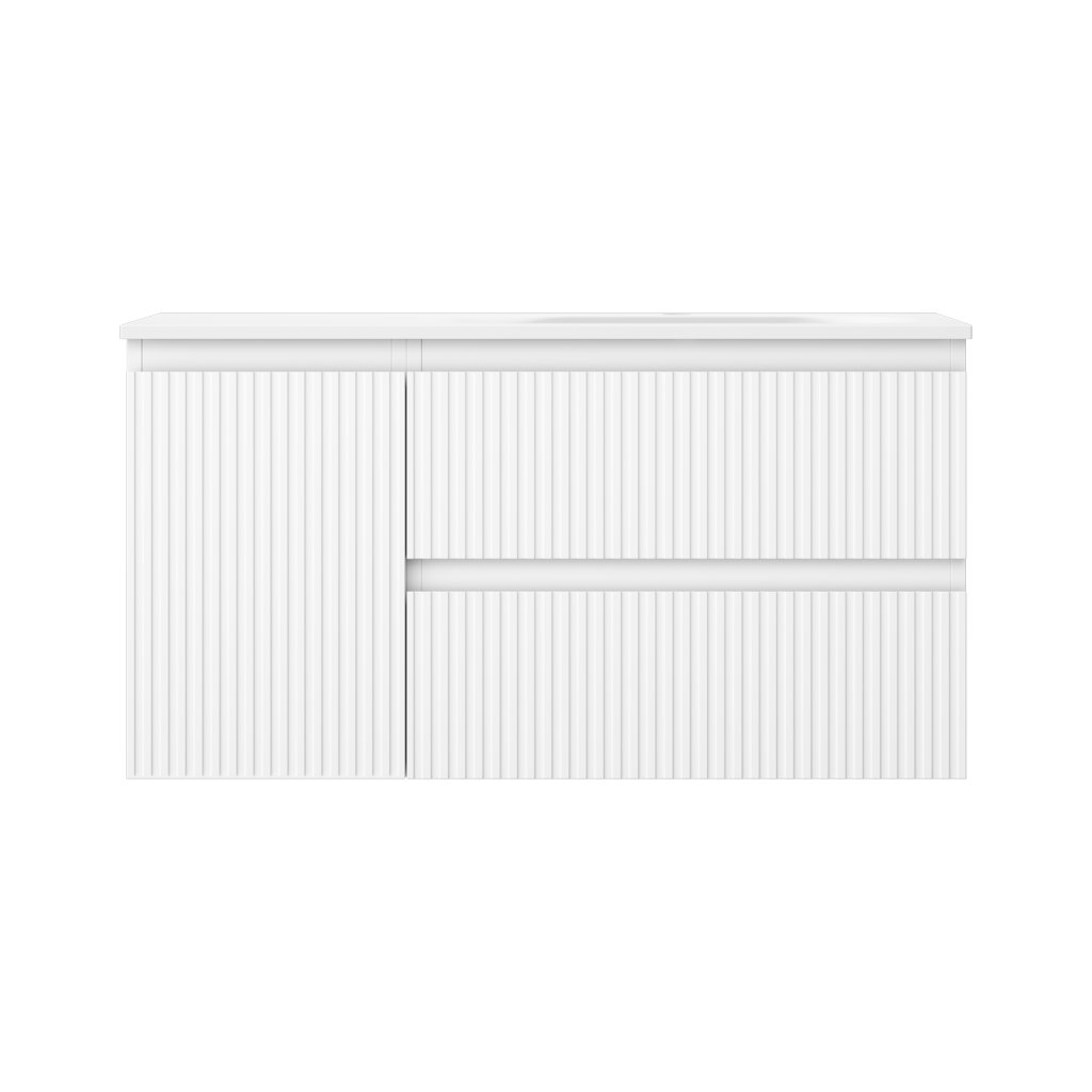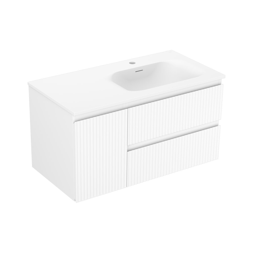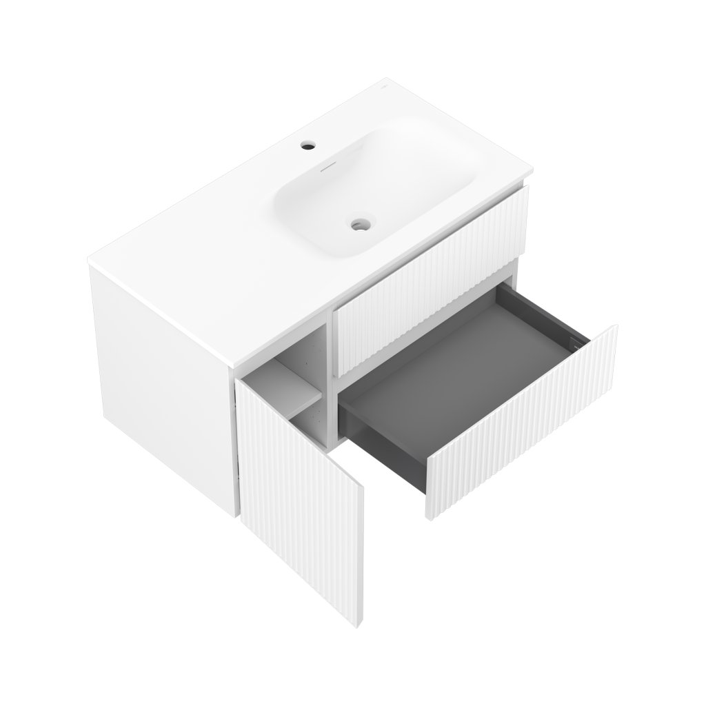 Mexen Rivel, kúpeľňová skrinka 90 cm s pravým umývadlom Vela, 2S, 1D, drážkovaná, biela matná, 91A23-09047-3-BBFFF01-W23P01