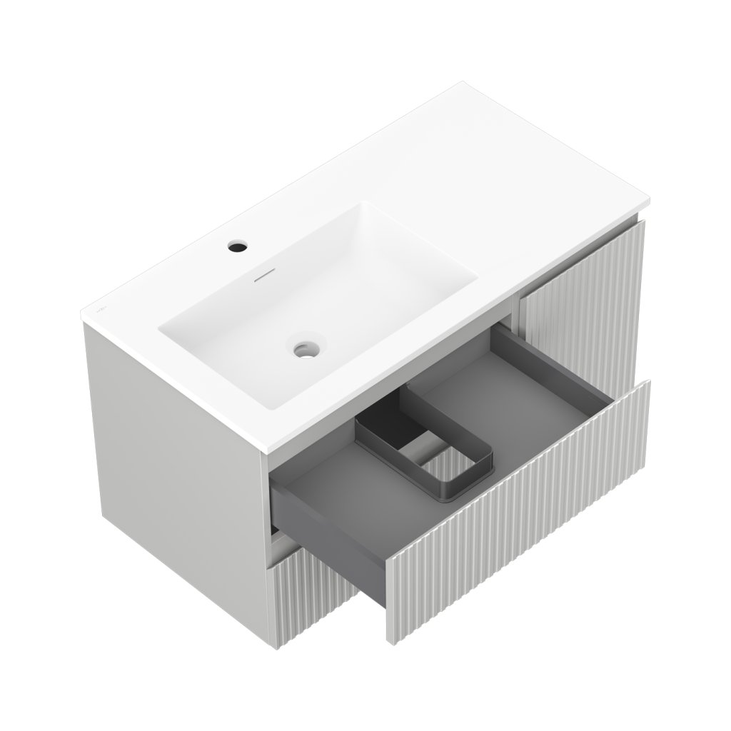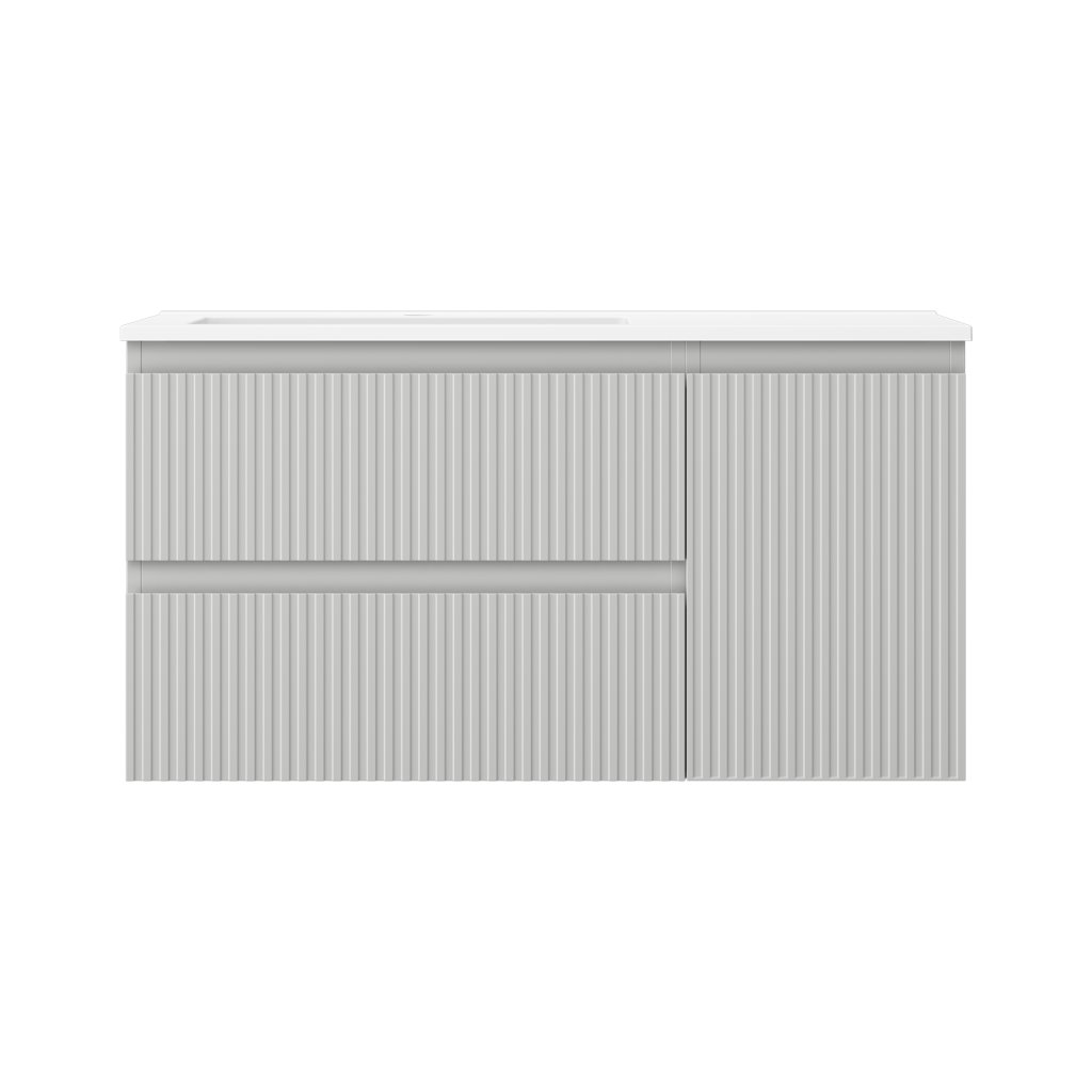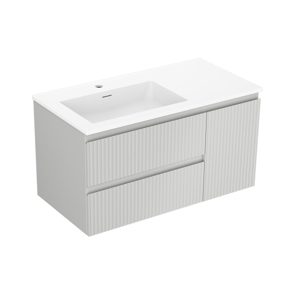Mexen Rivel, kúpeľňová skrinka 90 cm s umývadlom Otis vľavo, 2S, 1D, drážkovaná, sivá matná/biela matná - 91A23-09047-3-BBFFF62-W18L01