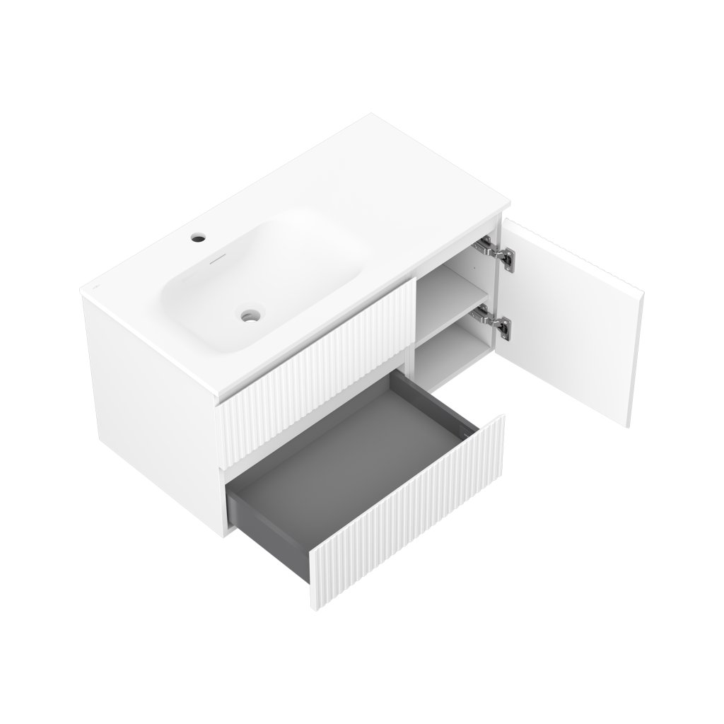 Mexen Rivel, kúpeľňová skrinka 90 cm s umývadlom Vela ľavá, 2S, 1D, drážkovaná, biela matná, 91A23-09047-3-BBFFF01-W23L01