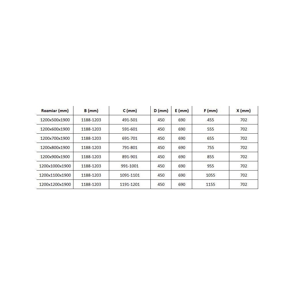 - Časť so sprchovými dverami (B min-max): rozmery v tabuľke dole