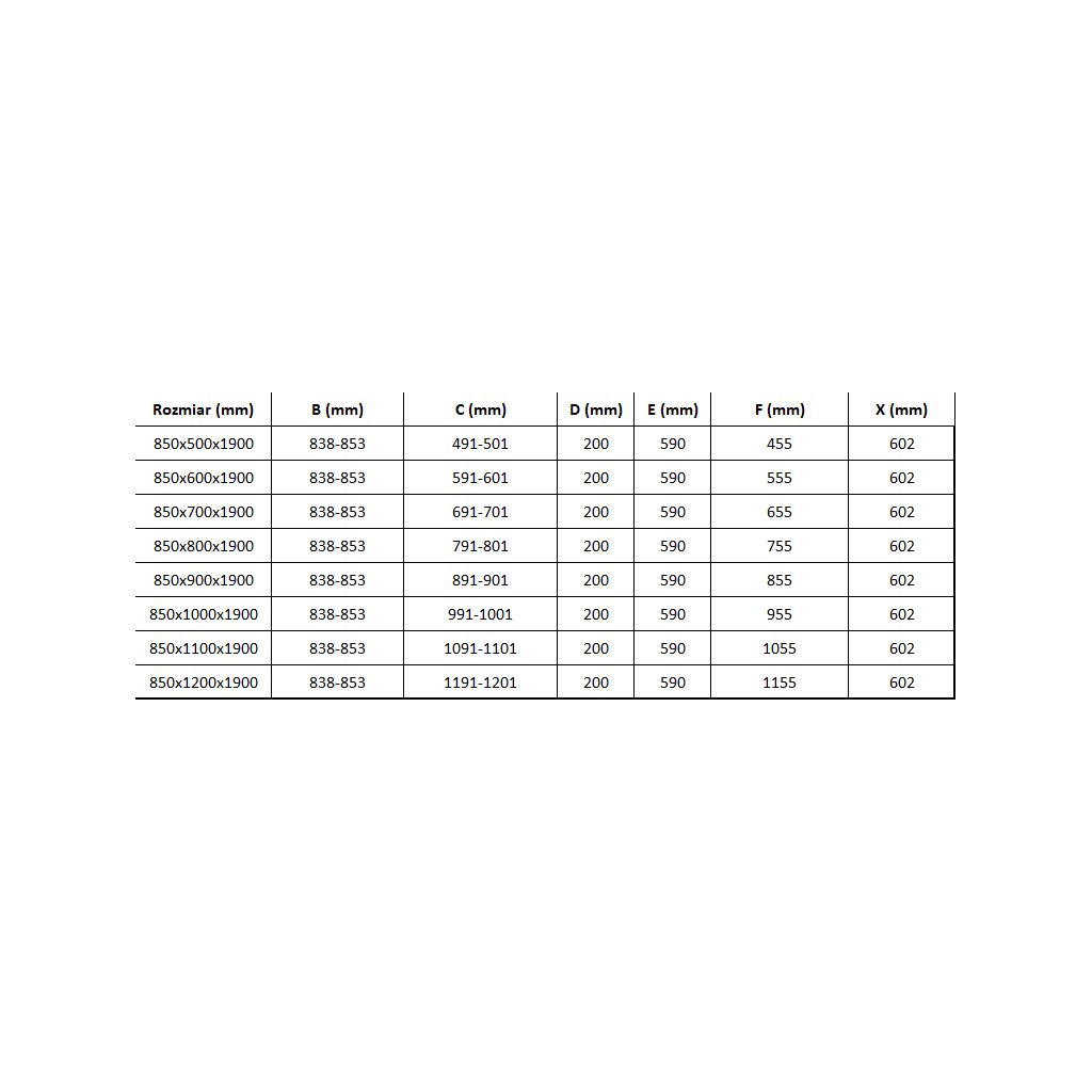 - Časť so sprchovými dverami (B min-max): rozmery v tabuľke dole