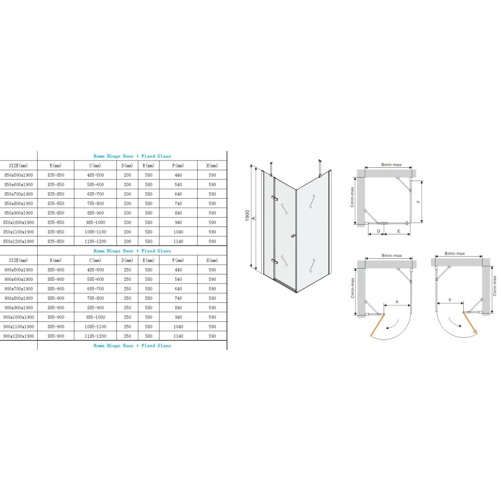 - Časť so sprchovými dverami (B min-max): rozmery v tabuľke dole