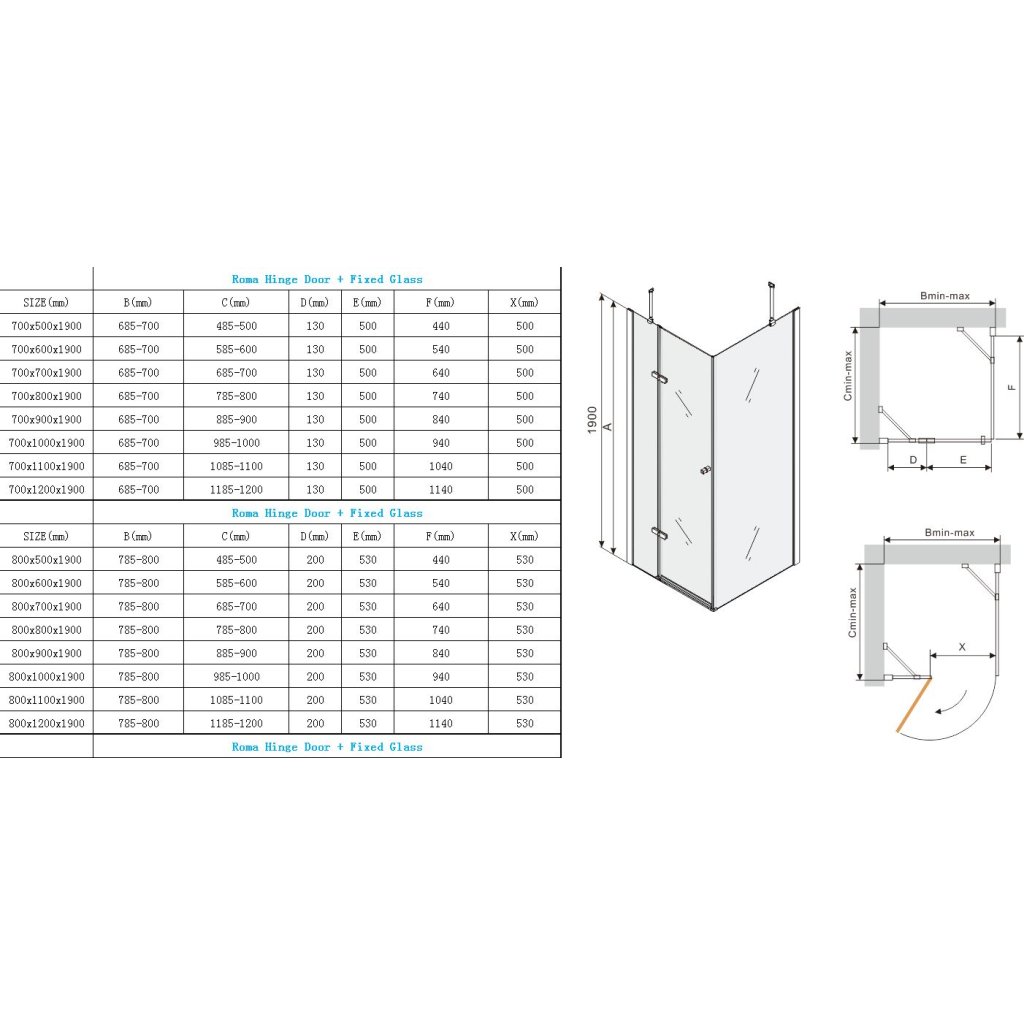 - Časť so sprchovými dverami (B min-max): rozmery v tabuľke dole