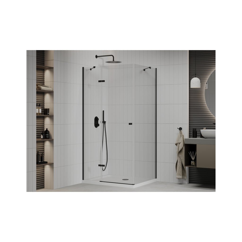Mexen Roma, sprchovací kút s 1-krídlovými dverami 120 (dvere) x 70 (stena) cm, 6mm číre sklo, čierny profil, slim sprchová vanička 5cm biela s čiernym sifónom, 854-120-070-70-00-4010B