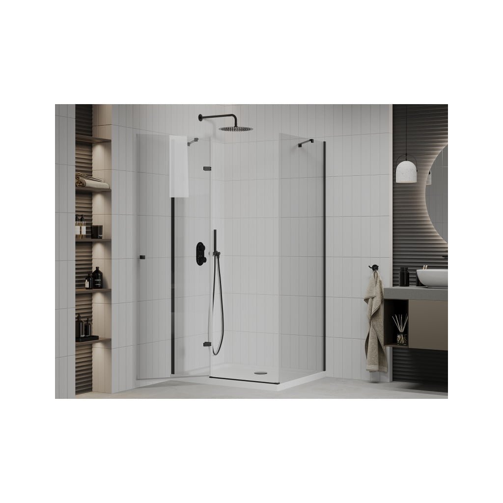 Mexen Roma, sprchovací kút s 1-krídlovými dverami 120 (dvere) x 90 (stena) cm, 6mm číre sklo, čierny profil, slim sprchová vanička 5cm biela s čiernym sifónom, 854-120-090-70-00-4010B