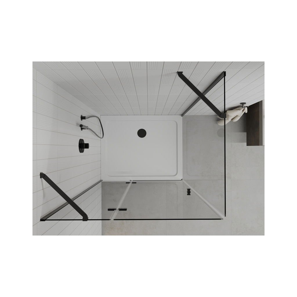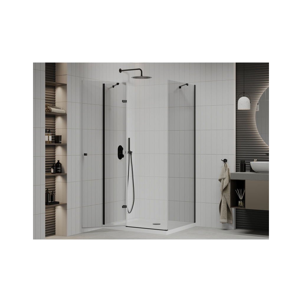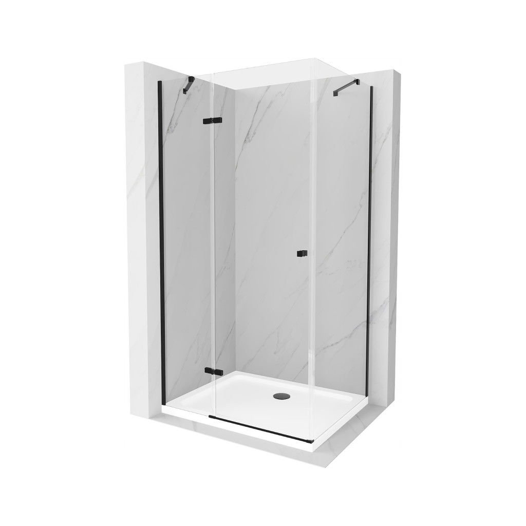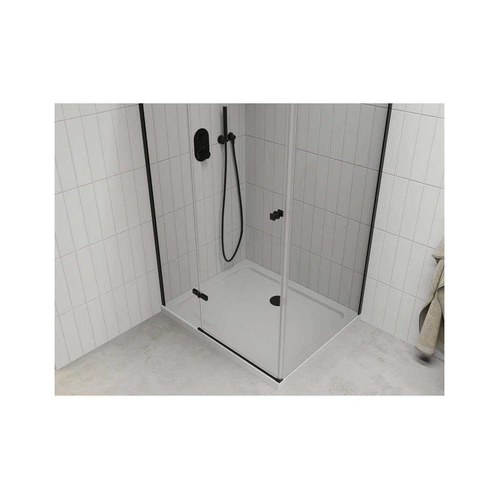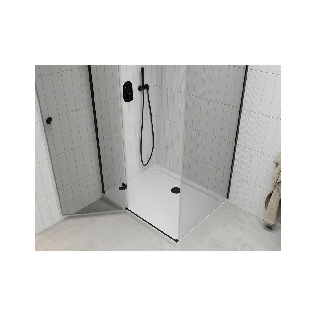 Mexen Roma, sprchovací kút s 1-krídlovými dverami 80 (dvere) x 110 (stena) cm, 6mm číre sklo, čierny profil, slim sprchová vanička 5cm biela s čiernym sifónom, 854-080-110-70-00-4010B