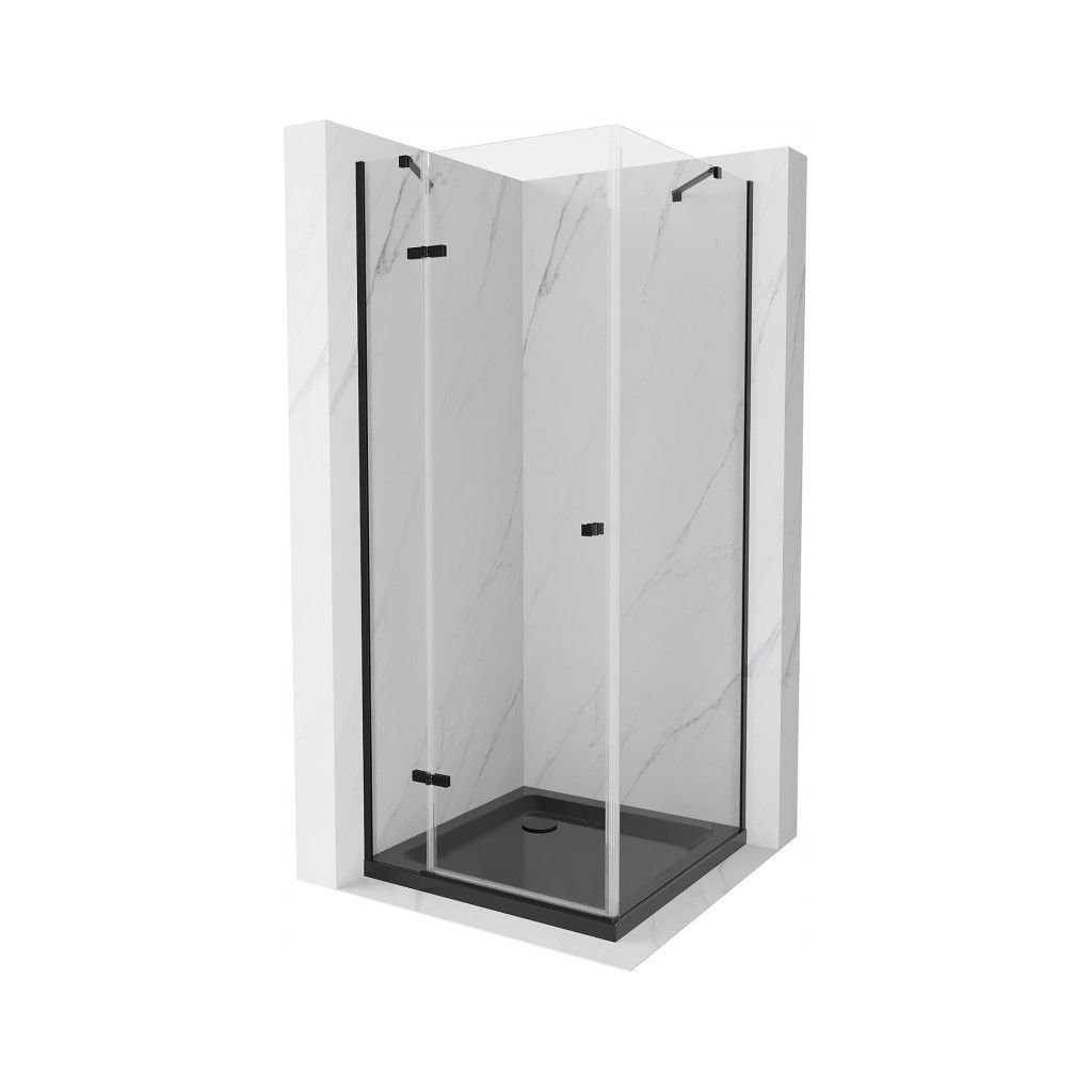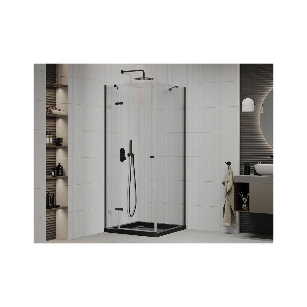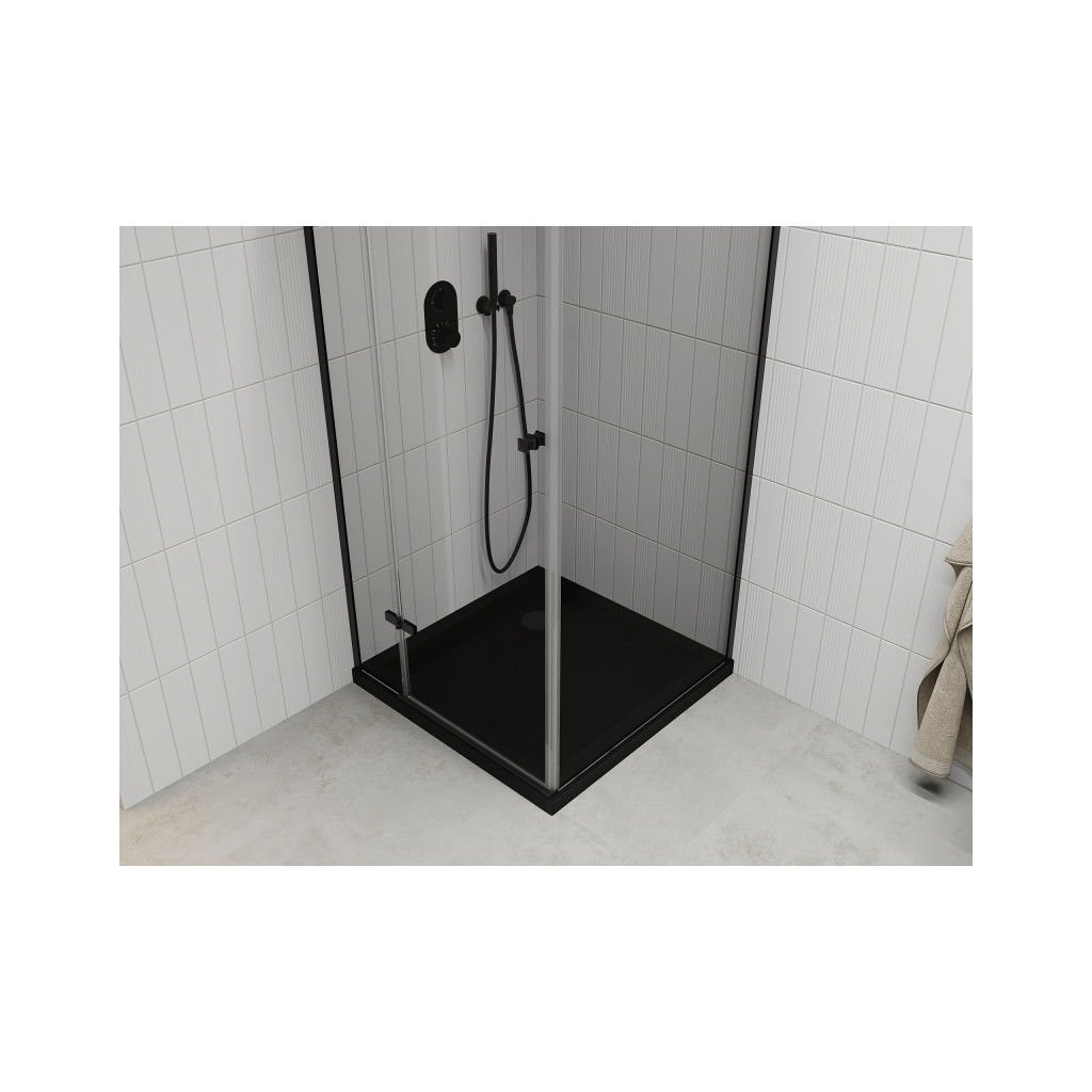 Mexen Roma, sprchovací kút s 1-krídlovými dverami 90 (dvere) x 90 (stena) cm, 6mm číre sklo, čierny profil, slim sprchová vanička 5cm čierna s čiernym sifónom, 854-090-090-70-00-4070B
