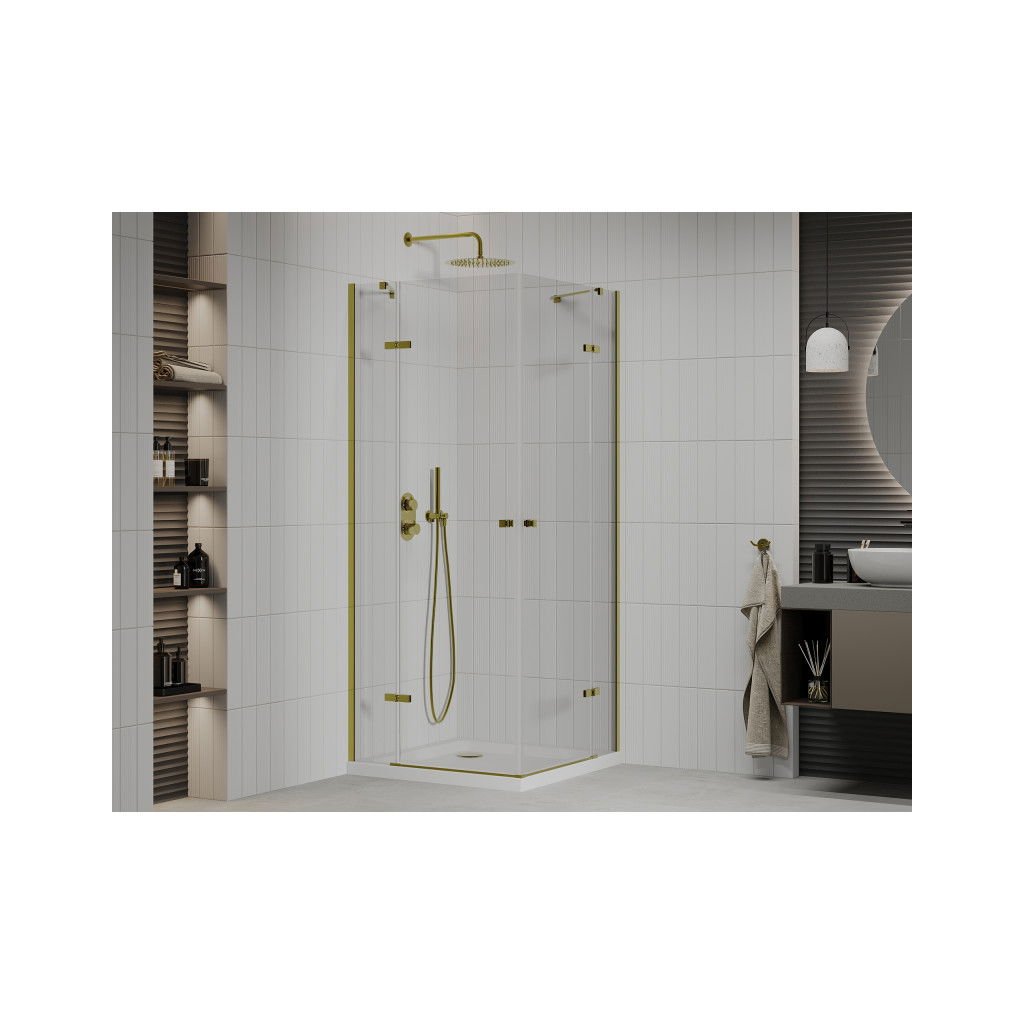 Mexen Roma Duo, sprchový kút 100 (dvere) x 100 (dvere) cm, 6mm číre sklo, zlatý profil + slim sprchová vanička biela 5cm + zlatý sifón, 854-100-100-50-02-4010G