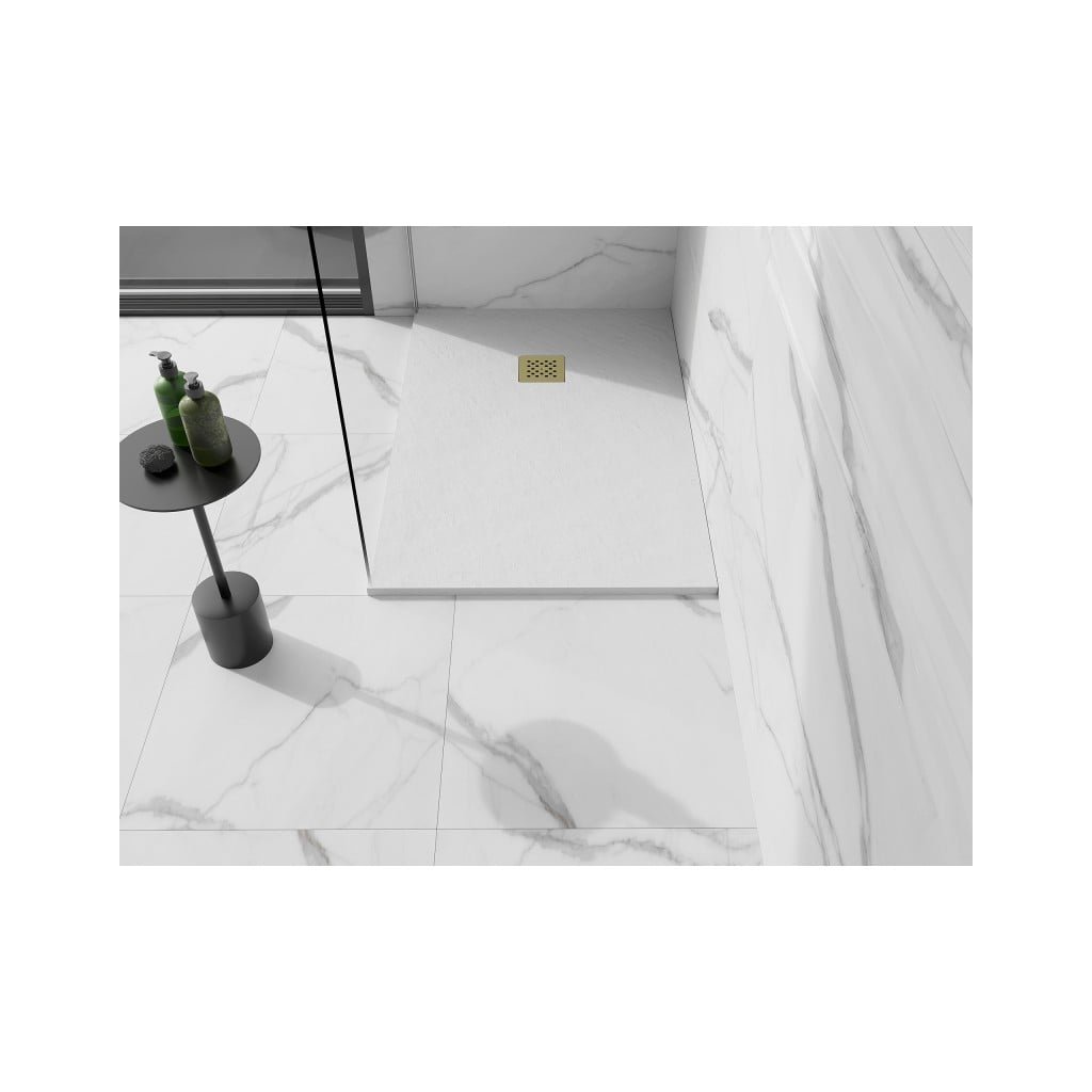 Mexen Stone+, obdĺžniková vanička z minerálneho kompozitu 130 x 80 cm, biela, zlatá lesklá krytka, 44108013-G