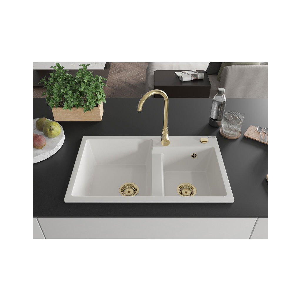 Mexen Tomas, granitový drez 800x500x190 mm, 2-komorový a zlatá batéria Telma, biela, 6516-20-670200-50